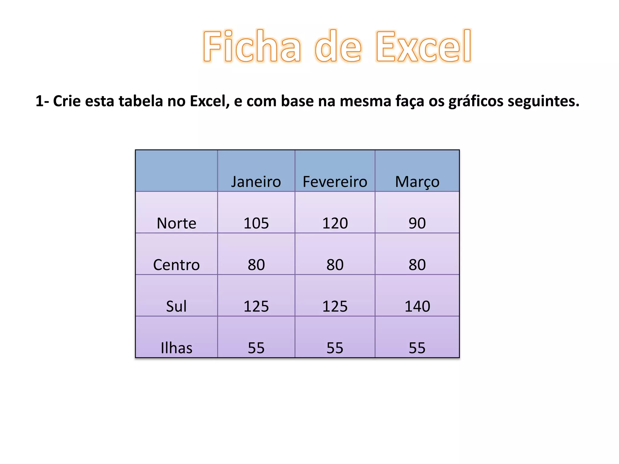 O documento apresenta uma tabela com as vendas de 4 regiões em 3 meses e pede para criar 5 gráficos com os dados: 1) vendas da região Norte ao longo dos meses; 2) vendas das 4 regiões em Janeiro; 3) vendas das 4 regiões em Março; 4) vendas trimestrais das 4 regiões; 5) vendas trimestrais das 4 regiões em porcentagem.
