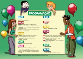 O documento é um programa de um seminário estadual sobre os 21 anos do Estatuto da Criança e do Adolescente. O seminário contará com palestras, oficinas, debates e apresentações culturais sobre temas como a proteção integral do adolescente, a aplicabilidade do Estatuto e a rede de proteção social. Os participantes poderão se inscrever pelo email ou telefone listados e receberão certificados no final do evento.