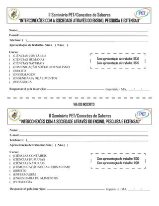 Este documento é um formulário de inscrição para o II Seminário PET/Conexões de Saberes sobre interconexões com a sociedade através do ensino, pesquisa e extensão. O formulário solicita nome, e-mail, telefone, curso e se haverá apresentação de trabalho, com taxas de R$10 para sem apresentação e R$15 para com apresentação.