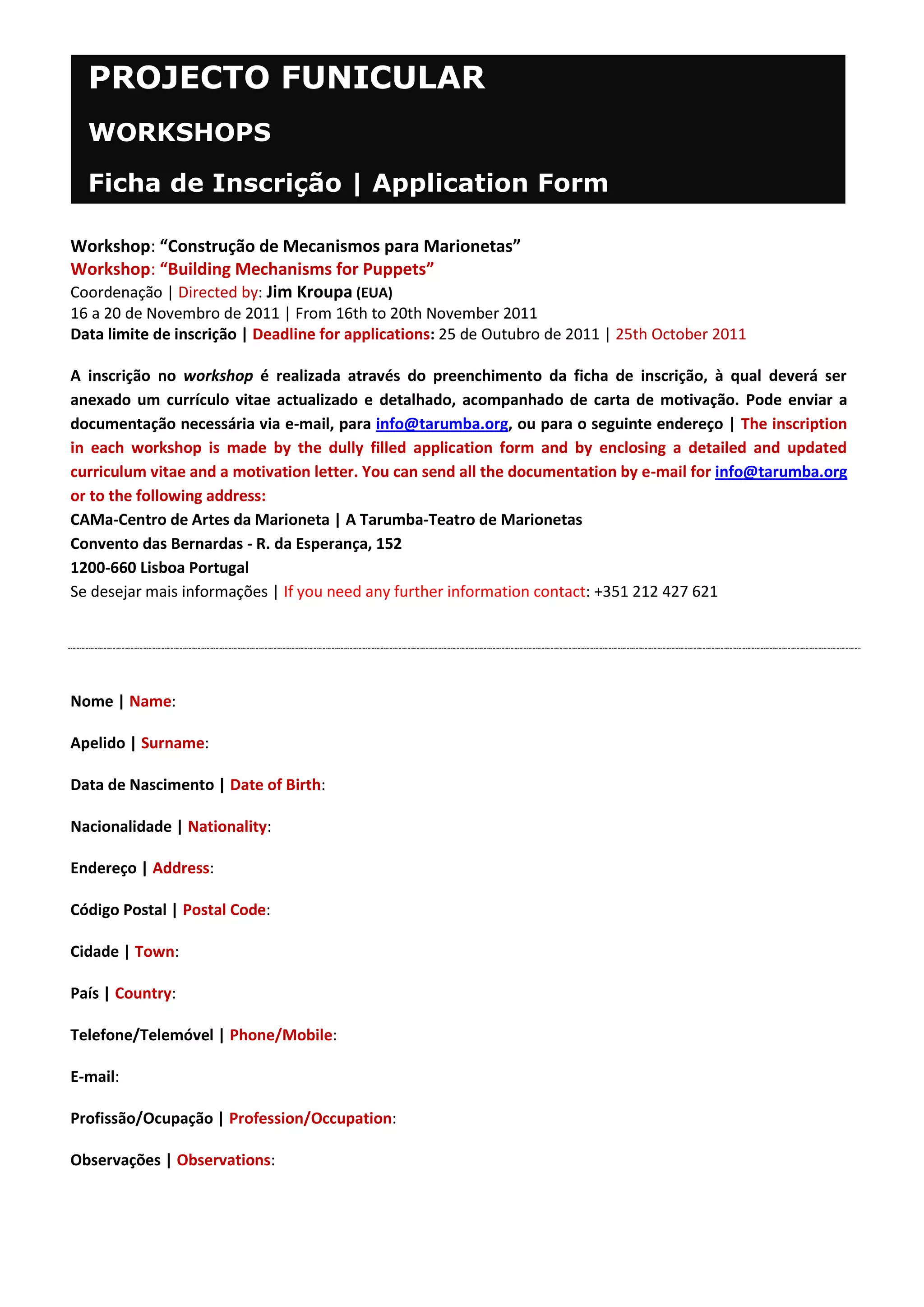 Este documento fornece informações sobre um workshop de construção de mecanismos para marionetas que será realizado entre 16 e 20 de novembro de 2011 em Lisboa, Portugal, coordenado por Jim Kroupa. As inscrições devem ser enviadas até 25 de outubro de 2011 preenchendo um formulário com currículo e carta de motivação.