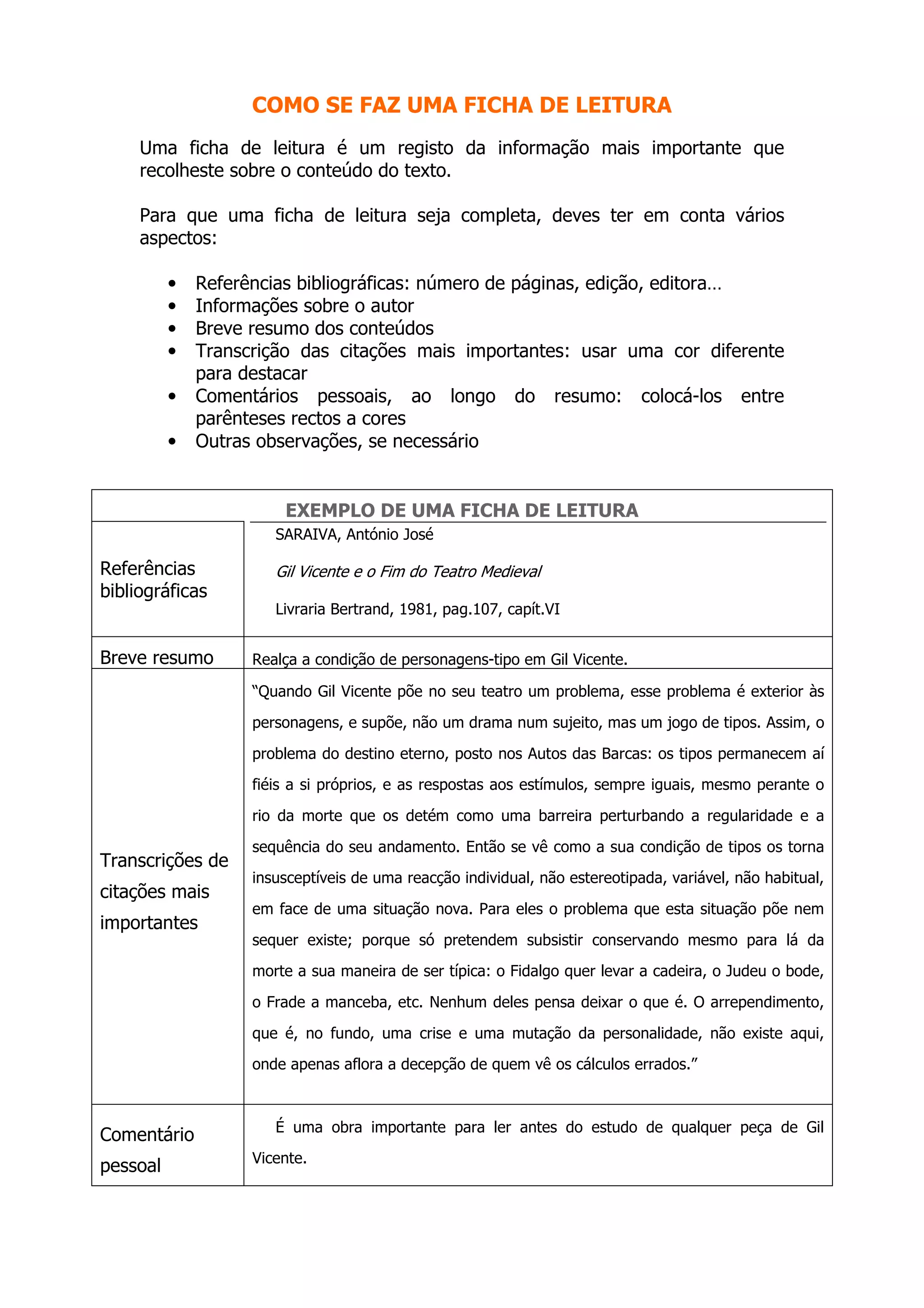 Este documento fornece instruções sobre como fazer uma ficha de leitura, incluindo referências bibliográficas, informações sobre o autor, um breve resumo dos conteúdos, transcrições de citações importantes e comentários pessoais. Inclui também um exemplo de ficha de leitura com estas características.