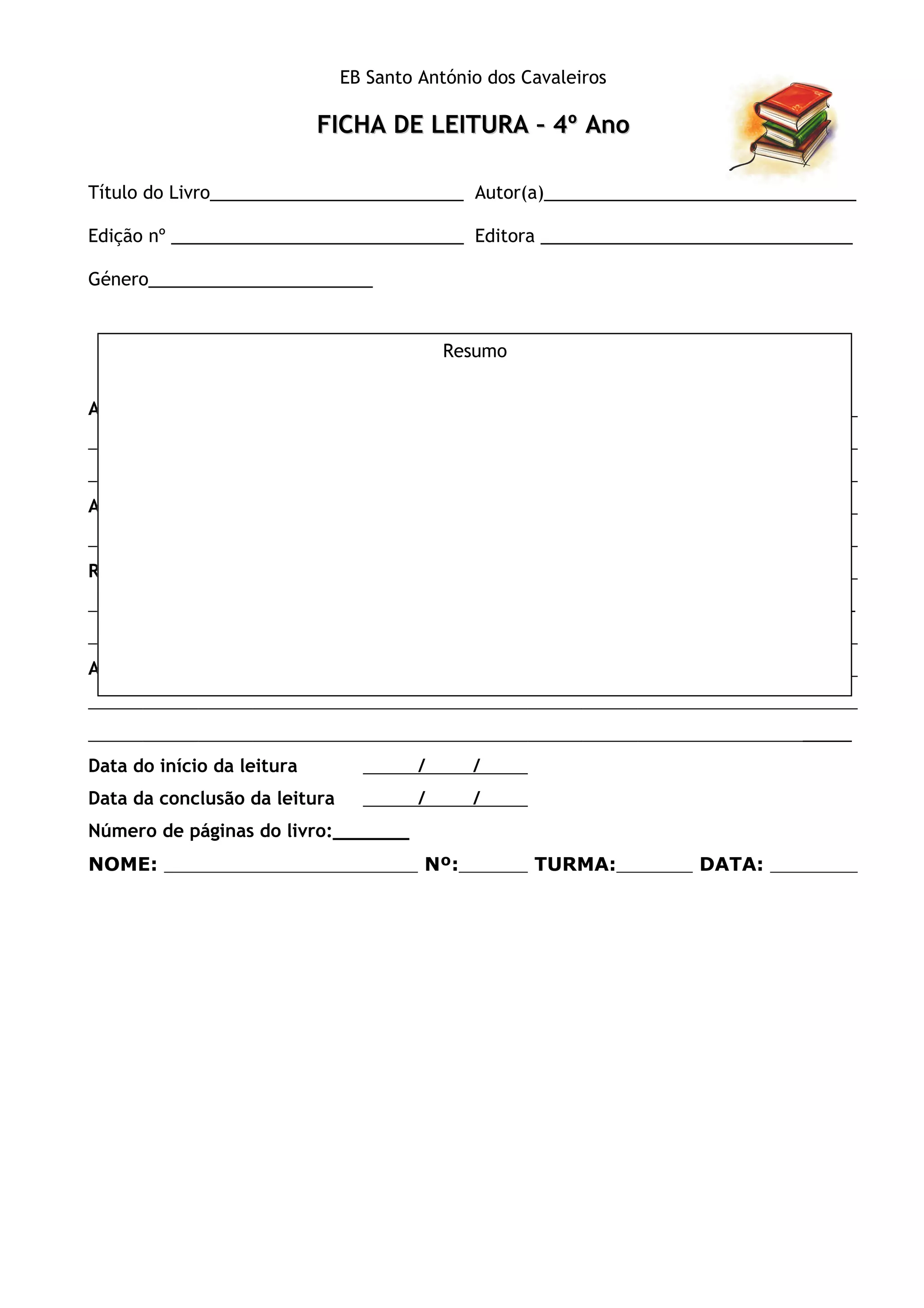 Este documento é uma ficha de leitura para um livro lido no 4o ano. Contém espaços para preencher o título, autor, editora, gênero, resumo, personagens preferidas e menos preferidas, interesses despertados e opinião sobre a leitura. Também contém espaços para datas de início e conclusão da leitura e número de páginas.