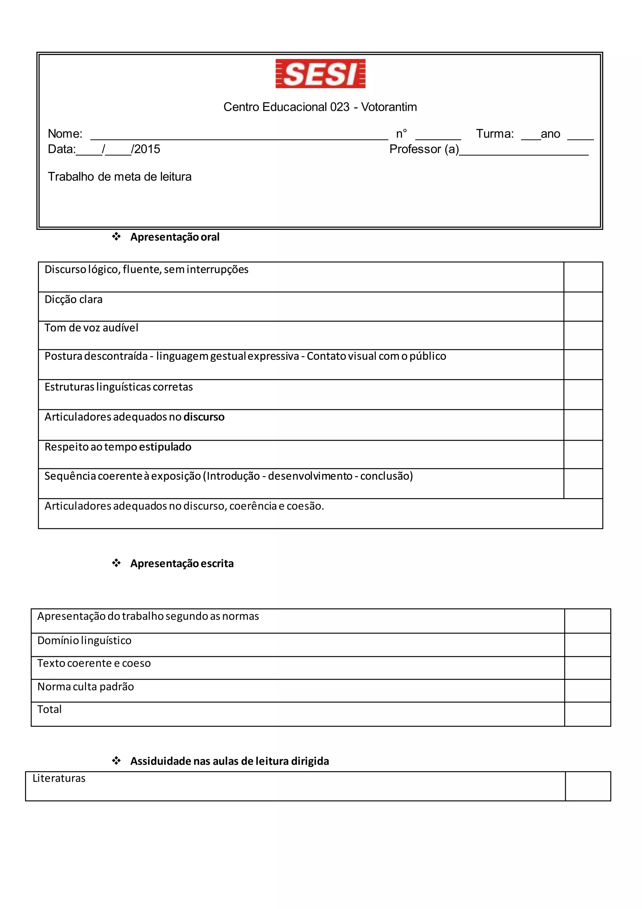 O documento lista os critérios de avaliação para apresentações orais e escritas, incluindo discurso lógico e fluente, dicção clara, postura, contato visual, estruturas linguísticas corretas, respeito ao tempo, coerência na sequência da apresentação, norma culta da língua portuguesa e total de pontos.