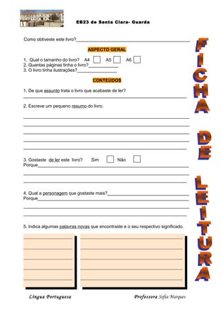 O documento é um questionário sobre um livro lido recentemente. Contém perguntas sobre o tamanho, número de páginas, ilustrações, assunto, resumo, opinião sobre o livro, personagem preferida e novas palavras encontradas.