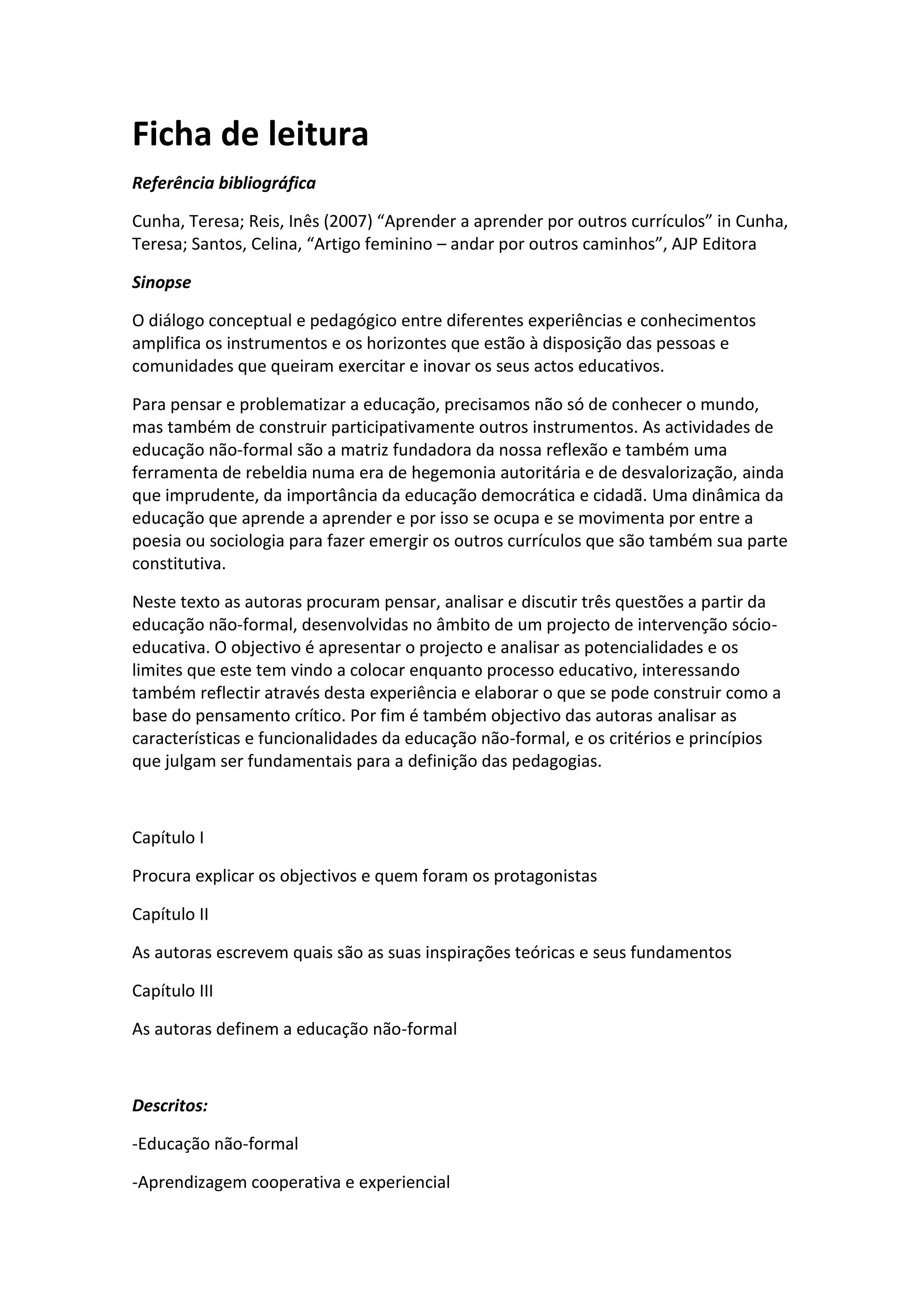 O texto discute a educação não-formal e seu potencial para promover a igualdade e os direitos humanos. As autoras definem a educação não-formal como um processo de aprendizagem ao longo da vida baseado em experiências participativas e cooperativas que desenvolvem competências pessoais e sociais. Elas também descrevem os princípios de uma pedagogia não-sexista, ecológica e pacífica necessária para essa abordagem educacional.