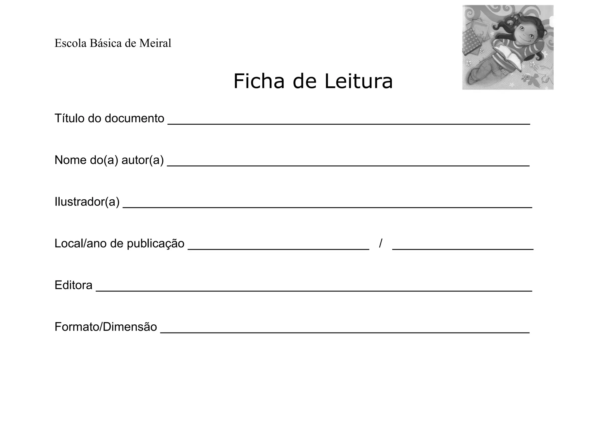 O documento é uma ficha de leitura destinada à escola básica de Meiral, que contém seções para informações sobre o título, autor, ilustrador, editora e formato. Inclui também campos para resumo, imagem/ilustração, citação favorita e apreciação global. O formato é estruturado para facilitar a análise e o registro de informações sobre obras literárias.