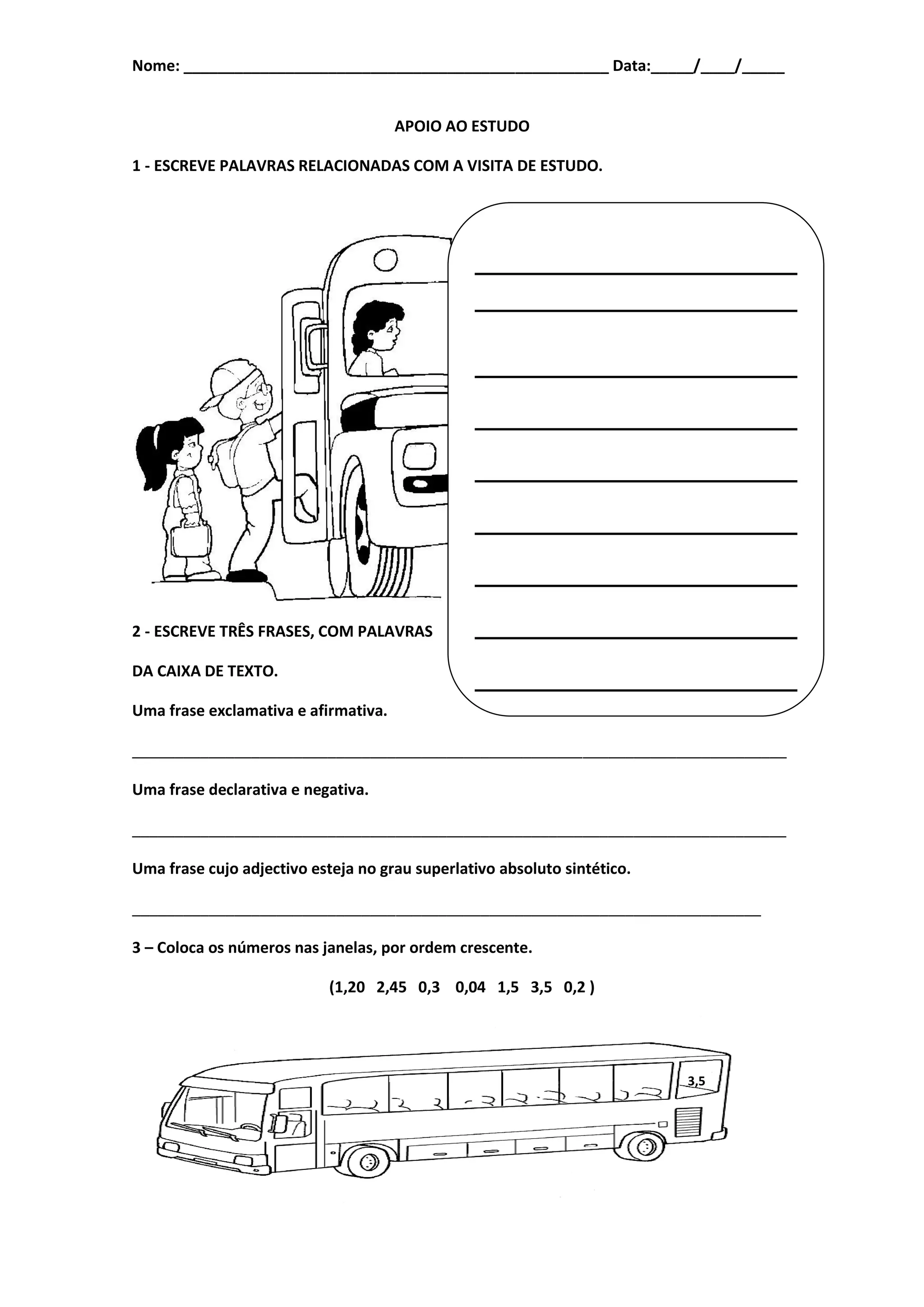 Este documento fornece três exercícios de apoio ao estudo: 1) escrever palavras relacionadas a uma visita de estudo, 2) escrever frases usando palavras fornecidas com diferentes tipos gramaticais, 3) colocar números em ordem crescente.