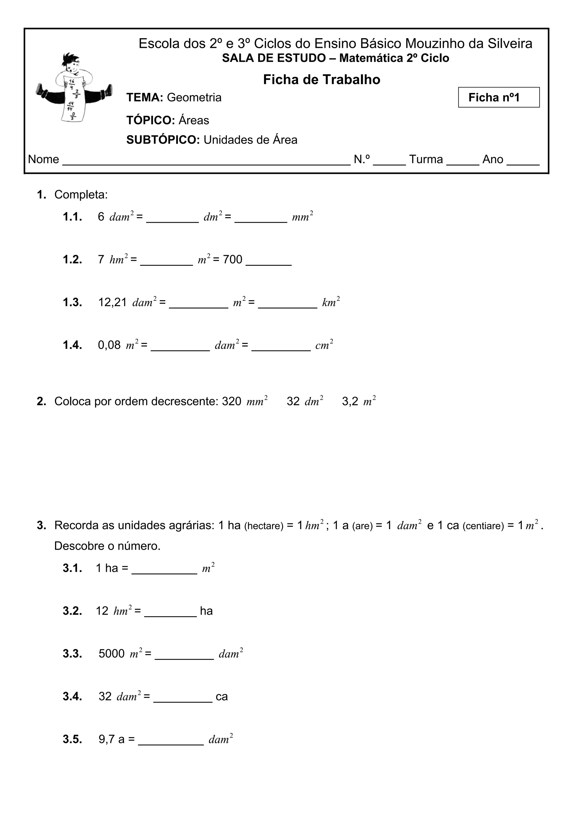 A ficha de trabalho trata de áreas e unidades de área. Ela contém exercícios para converter entre diferentes unidades de área como dm2, m2, km2, mm2 e outras unidades agrárias como ha, hm2, a, dam2 e ca. Os estudantes devem completar tabelas de conversão de unidades e ordenar áreas por ordem decrescente.
