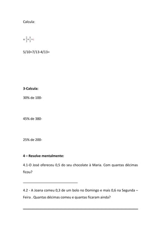 1) O documento é uma ficha de matemática contendo 12 problemas de adição, subtração, multiplicação, divisão, porcentagem e proporções.