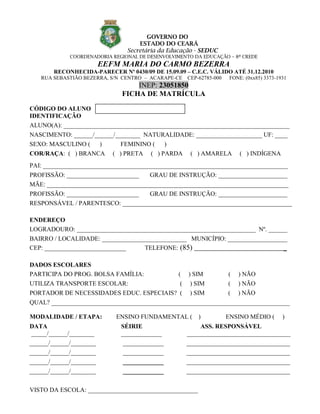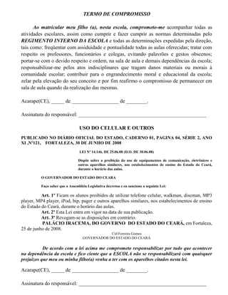 O documento é uma ficha de matrícula de um aluno em uma escola no Ceará. Contém informações pessoais do aluno e dos pais, endereço, dados escolares e termos de compromisso assinados pelo responsável sobre frequência, comportamento e proibição do uso de celulares e outros aparelhos durante aulas.