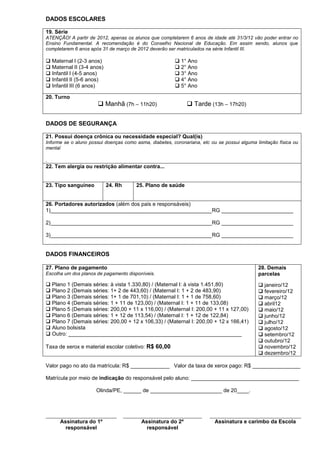 Este documento é uma ficha de matrícula escolar contendo seções para preenchimento de dados do aluno, responsáveis, escolares e financeiros. Oferece diferentes planos de pagamento para a anuidade escolar e taxa por material didático. Informa também critérios de idade para matrícula nas séries do Ensino Fundamental.