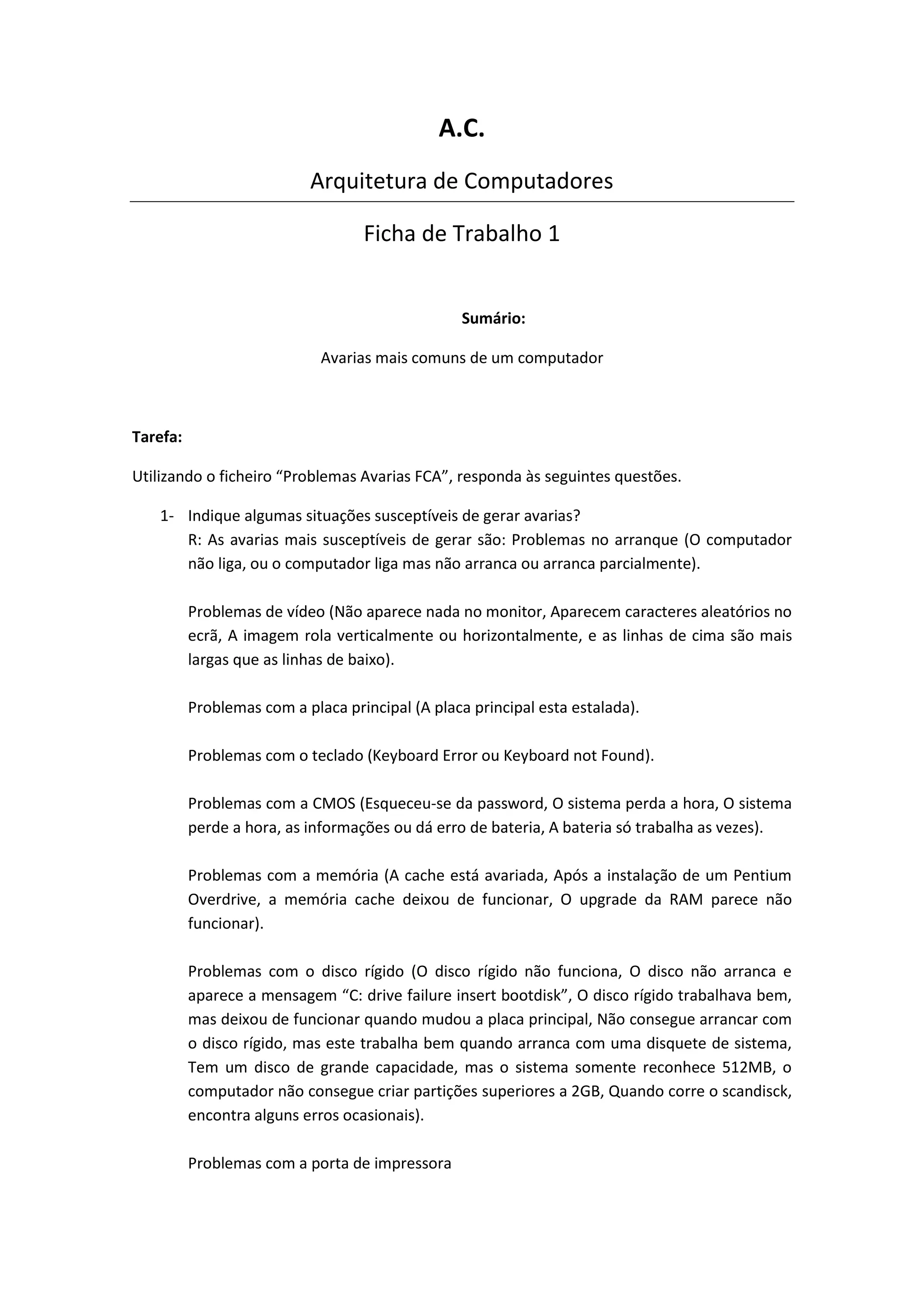O documento discute avarias comuns em computadores, como problemas de inicialização, vídeo, placa-mãe, teclado, CMOS, memória e disco rígido. Ele também aborda formas de identificar a origem das avarias, como mensagens de erro, códigos beeps e códigos LED, e explica o que são códigos beeps e onde são programados.