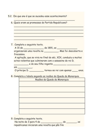 Este documento contém perguntas sobre a história de Portugal, cobrindo tópicos como o regime monárquico vs republicano, a Primeira República, a Ditadura de Salazar, as guerras coloniais em África. As perguntas requerem que o estudante complete frases e tabelas com informações sobre esses eventos e períodos históricos.