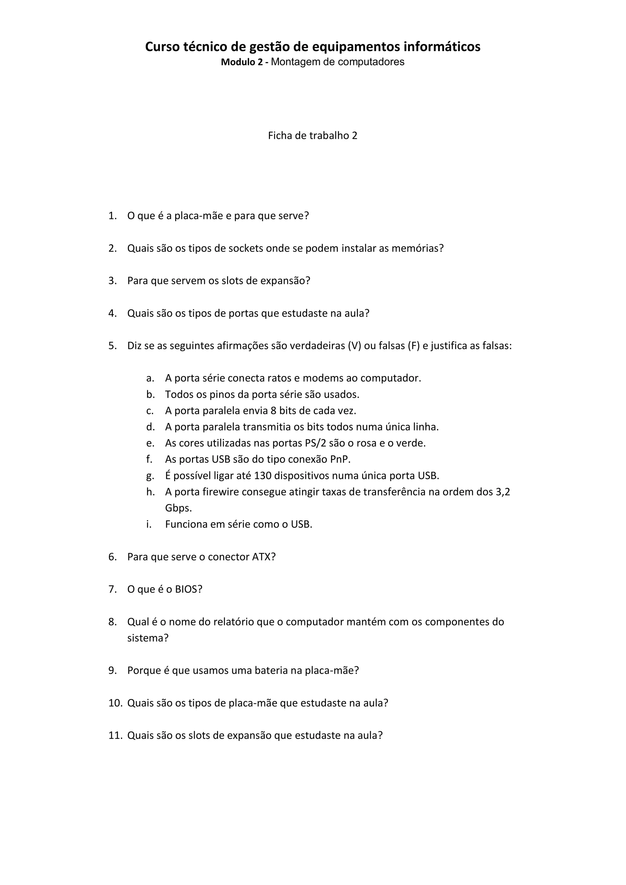 A ficha de trabalho aborda os componentes internos de um computador, incluindo a placa-mãe e suas funções, tipos de memória e slots de expansão, portas de entrada e saída, e conectores. Além disso, pede aos alunos para identificarem afirmações verdadeiras ou falsas sobre esses tópicos e legendar uma figura com os componentes internos de um computador.