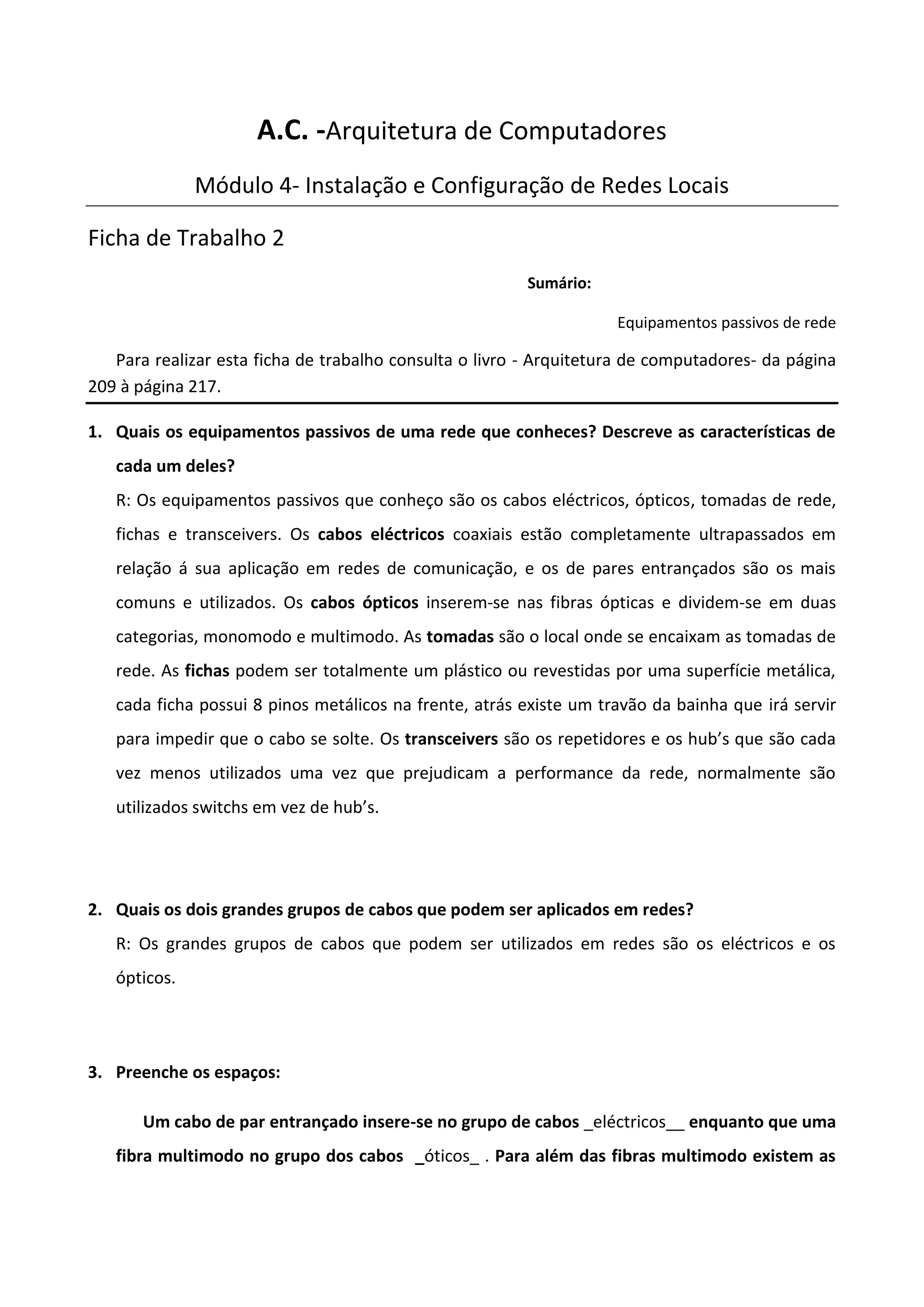 Este documento descreve equipamentos passivos de rede como cabos elétricos, ópticos, tomadas e fichas. Detalha os dois principais tipos de cabos usados em redes - elétricos e ópticos - e fornece as categorias de cabos de par trançado mais comuns atualmente, suas taxas de transferência e distâncias máximas permitidas.