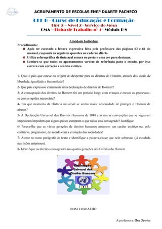 O documento fornece instruções para responder a perguntas sobre direitos humanos após ler um manual. As perguntas cobrem tópicos como a origem dos ideais de liberdade, igualdade e fraternidade; a declaração de direitos do homem; e a evolução progressiva dos direitos humanos de acordo com as sociedades.