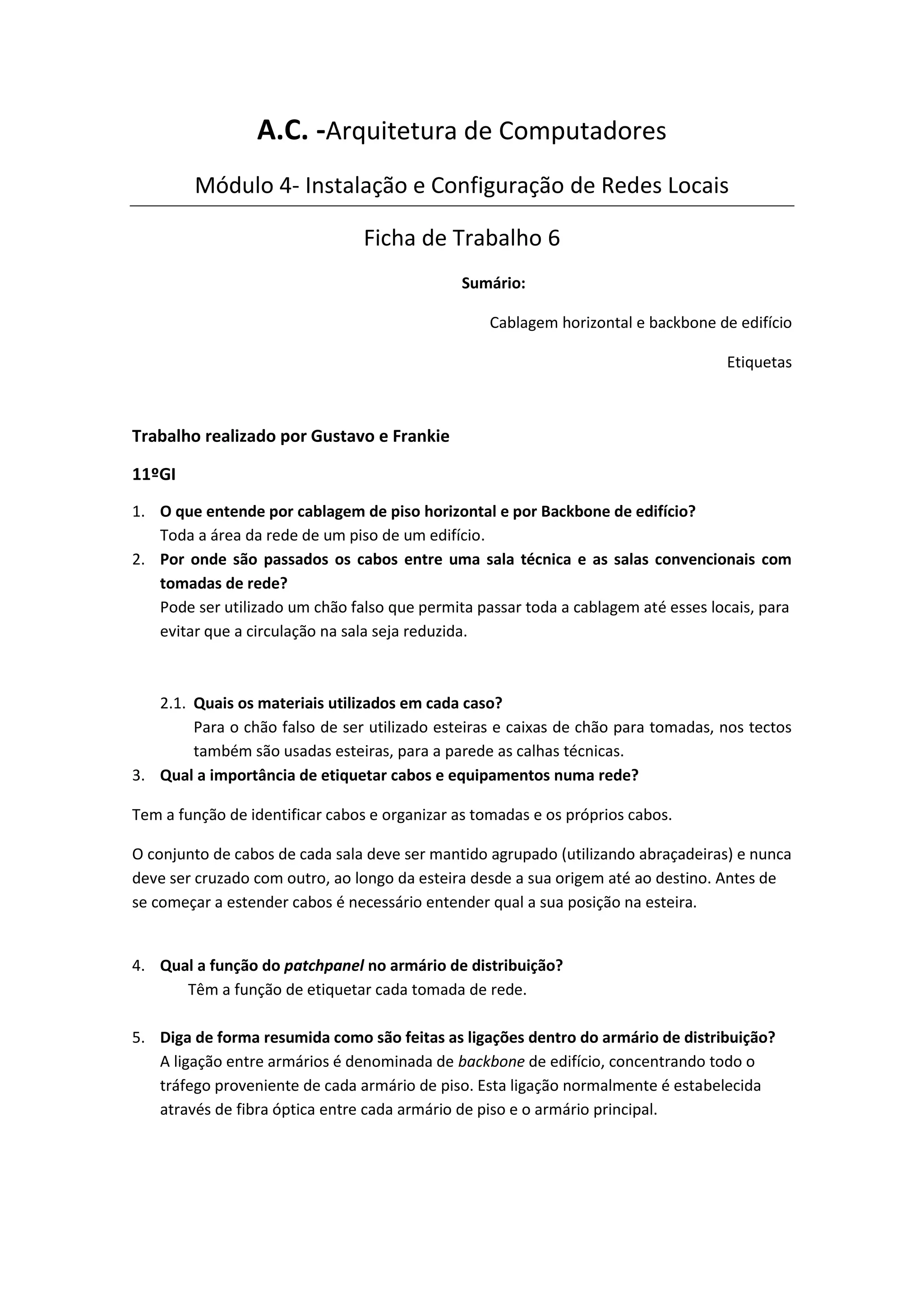 Este documento resume os principais conceitos de cablagem de redes locais em edifícios, incluindo a cablagem horizontal de cada piso, o uso de chão falso e esteiras para passagem de cabos, a importância de etiquetagem, e o uso de patch panels e backbone de fibra óptica para ligar armários de distribuição.