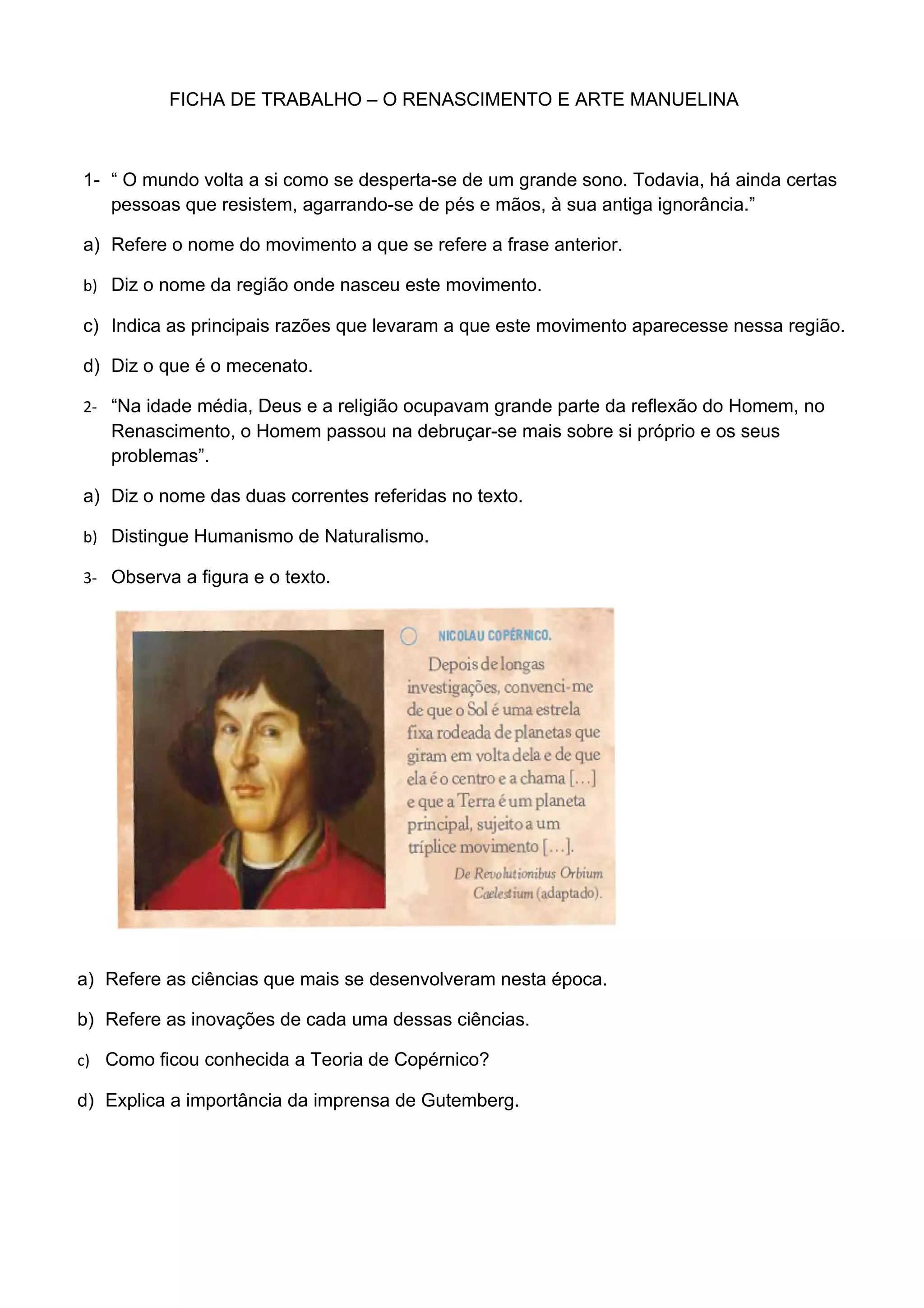 O documento resume os principais aspectos do Renascimento e da arte Manuelina em Portugal. Aborda o surgimento do Renascimento na Itália, o foco no ser humano, o desenvolvimento das ciências como Astronomia e o surgimento da imprensa. Também discute as características da arte renascentista como perspectiva e proporção e menciona pintores como Leonardo da Vinci. Por fim, explica a arte Manuelina em Portugal e seu estilo decorativo baseado em motivos marítimos.