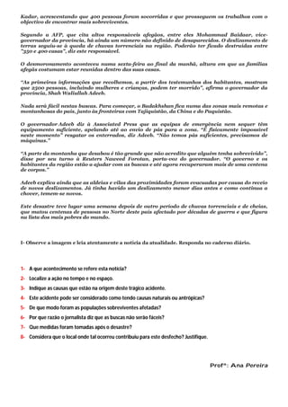 Um deslizamento de terras causado por chuvas torrenciais no Afeganistão matou pelo menos 350 pessoas e pode ter matado até 2.500. Centenas de casas foram soterradas e há o receio de novos deslizamentos devido às fortes chuvas continuarem. As equipas de resgate têm dificuldade em chegar à remota região montanhosa e falta equipamento para procurar sobreviventes.