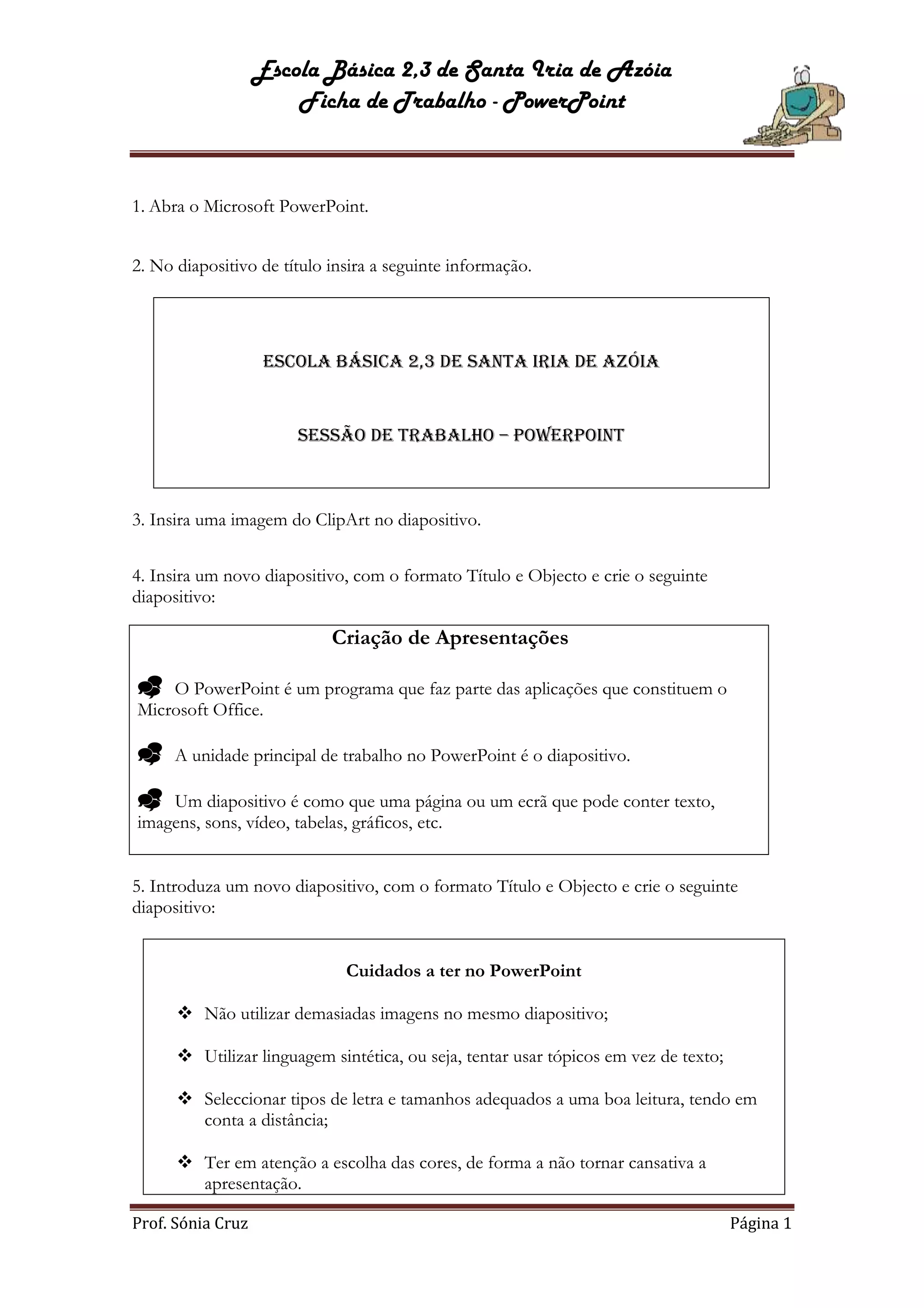 Este documento fornece instruções passo-a-passo para criar uma apresentação no PowerPoint sobre formas de criação de apresentações. Inclui a inserção de texto, imagens e hiperligações entre diapositivos, além de formatar os diapositivos com tema, transições e rodapé. O objetivo é criar uma apresentação profissional sobre o tema.