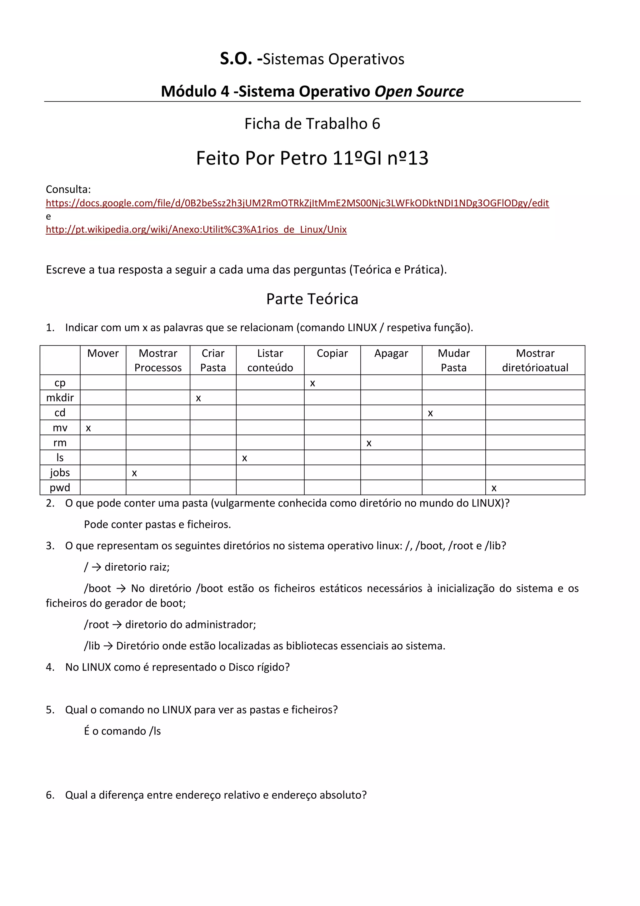 1. Indicar com um x as palavras que se relacionam (comando LINUX / respetiva função).