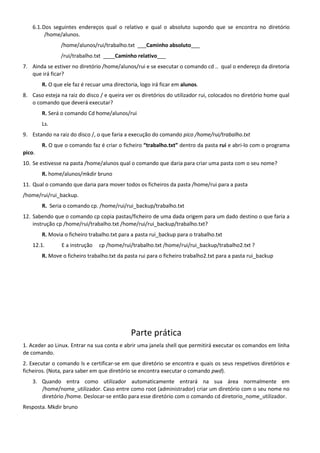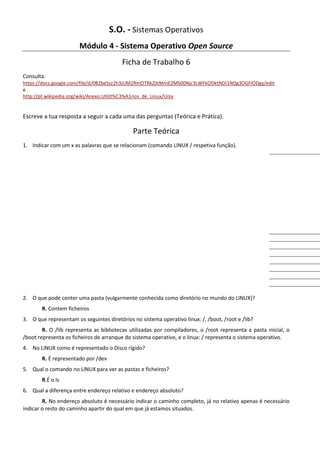 1. O documento fornece uma ficha de trabalho sobre sistemas operativos Linux com perguntas teóricas e práticas sobre comandos e diretórios.