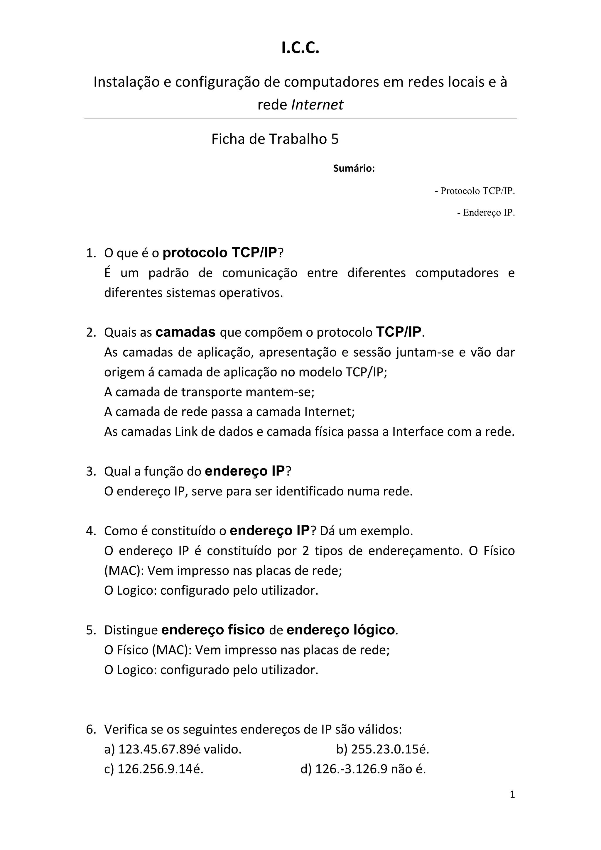 O documento discute o protocolo TCP/IP e endereços IP, resumindo:
