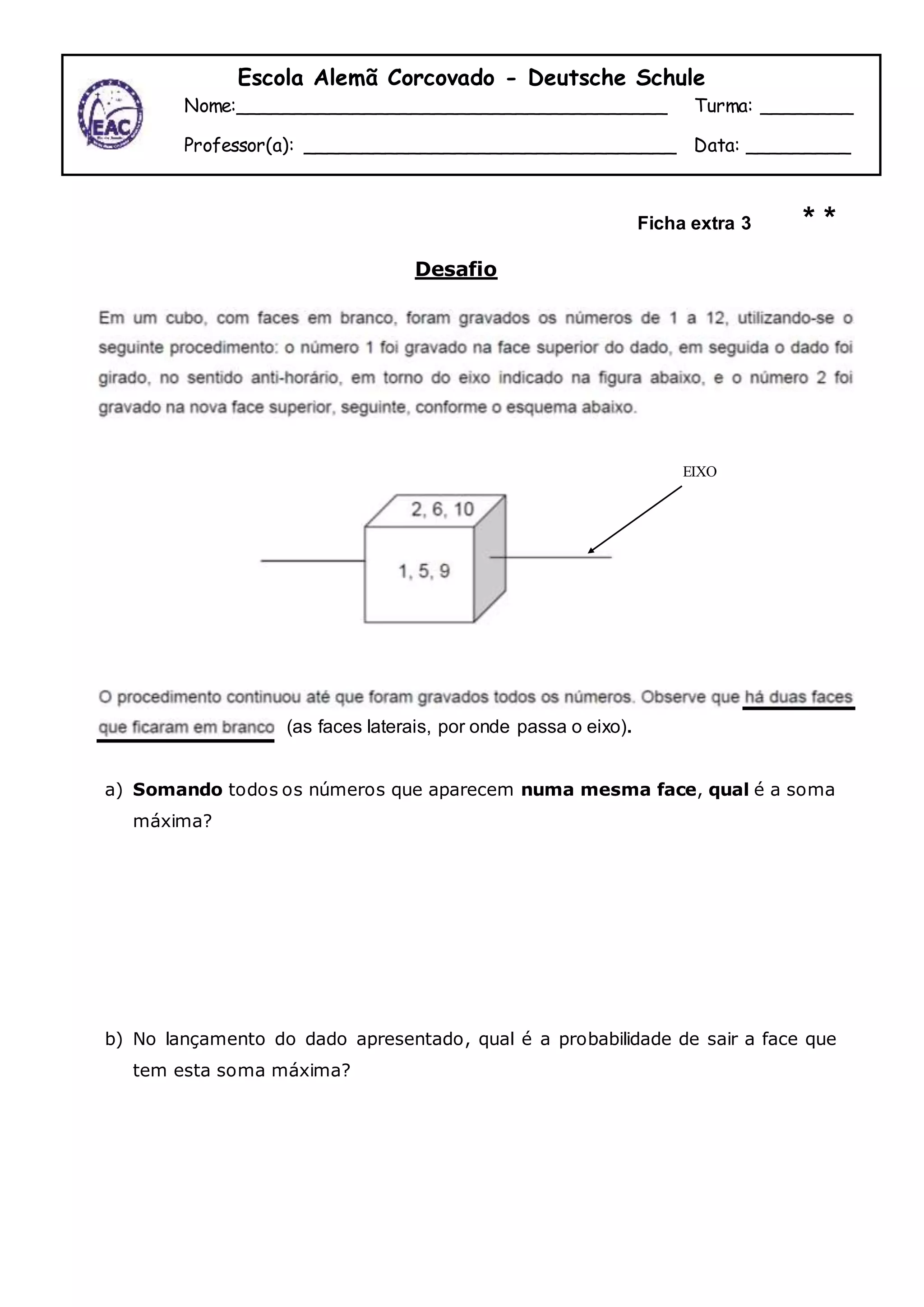 A ficha apresenta um dado com números em suas faces e pede para (1) calcular a soma máxima dos números em uma mesma face e (2) calcular a probabilidade de cair na face com essa soma máxima.