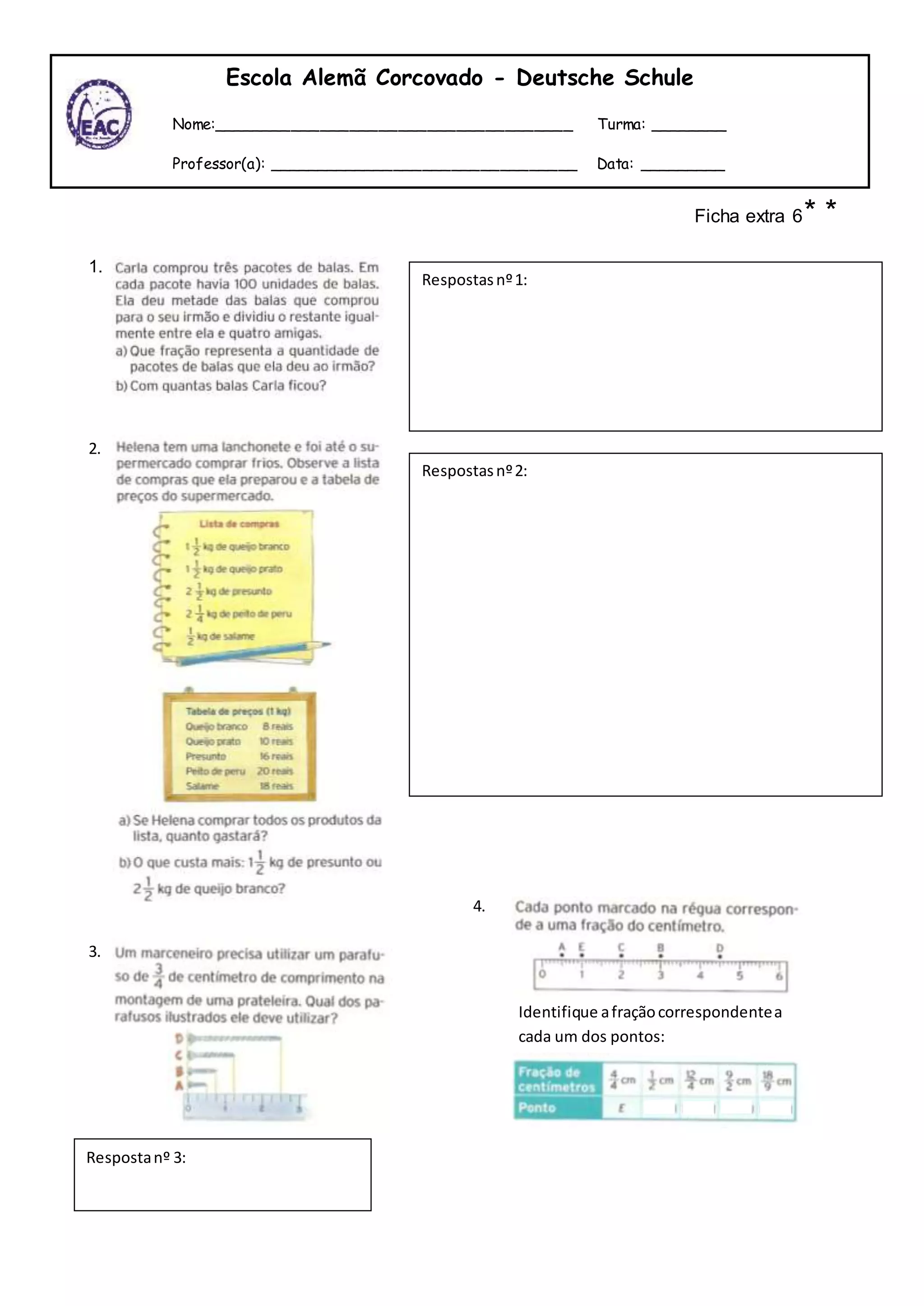 O documento é uma ficha de exercícios para alunos da Escola Alemã Corcovado sobre frações. Contém espaços para o nome do aluno, turma, professor e data, bem como três questões sobre identificar frações correspondentes a pontos numéricos.