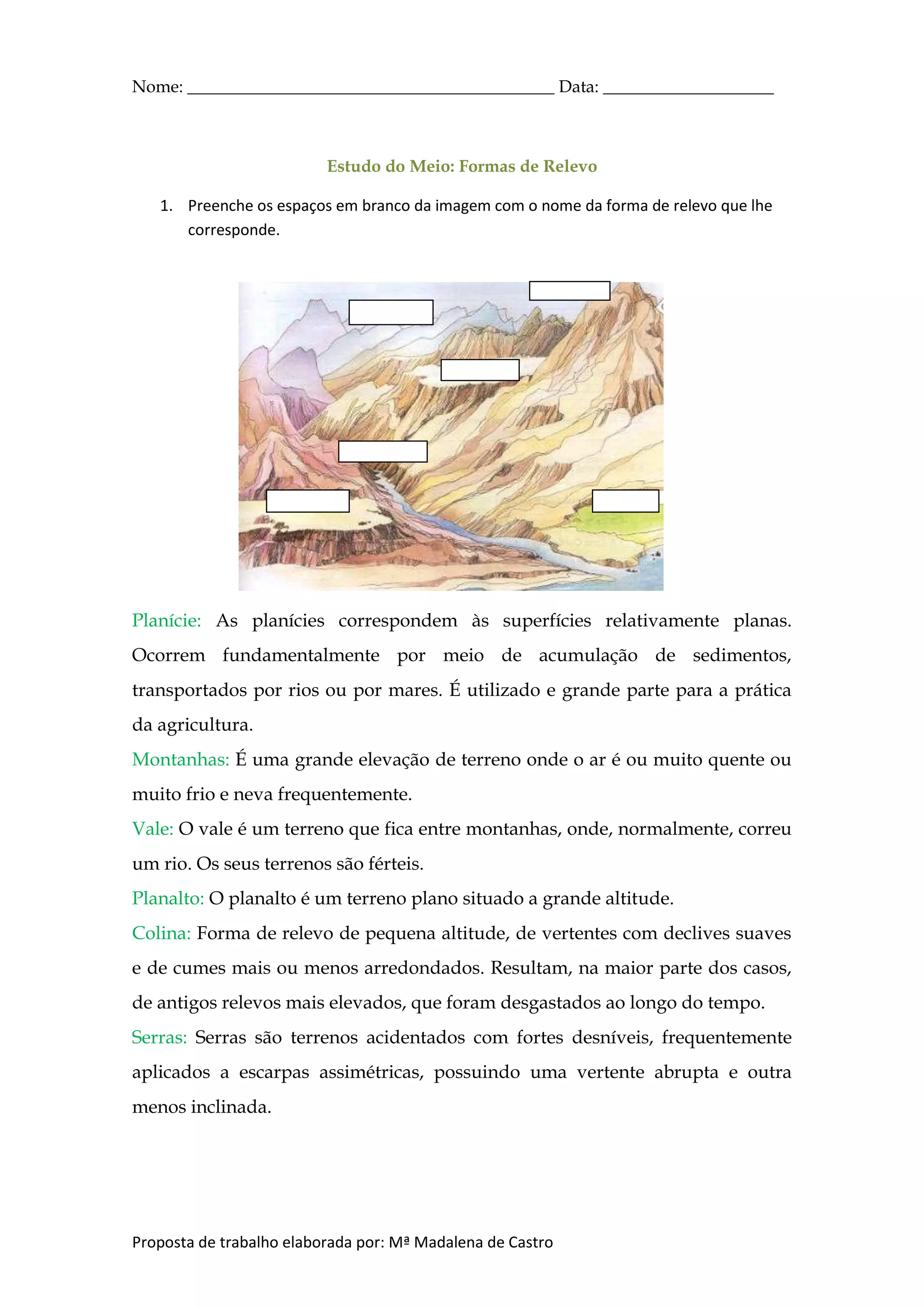 Nome: ___________________________________________ Data:____________________<br />Estudo do Meio: Formas de Relevo<br />Preenche os espaços em branco da imagem com o nome da forma de relevo que lhe corresponde.<br />872490194945<br />Planície: As planícies correspondem às superfícies relativamente planas. Ocorrem fundamentalmente por meio de acumulação de sedimentos, transportados por rios ou por mares. É utilizado e grande parte para a prática da agricultura. <br />Montanhas: É uma grande elevação de terreno onde o ar é ou muito quente ou muito frio e neva frequentemente. <br />Vale: O vale é um terreno que fica entre montanhas, onde, normalmente, correu um rio. Os seus terrenos são férteis. <br />Planalto: O planalto é um terreno plano situado a grande altitude. <br />Colina: Forma de relevo de pequena altitude, de vertentes com declives suaves e de cumes mais ou menos arredondados. Resultam, na maior parte dos casos, de antigos relevos mais elevados, que foram desgastados ao longo do tempo. <br />Serras: Serras são terrenos acidentados com fortes desníveis, frequentemente aplicados a escarpas assimétricas, possuindo uma vertente abrupta e outra menos inclinada. <br />
