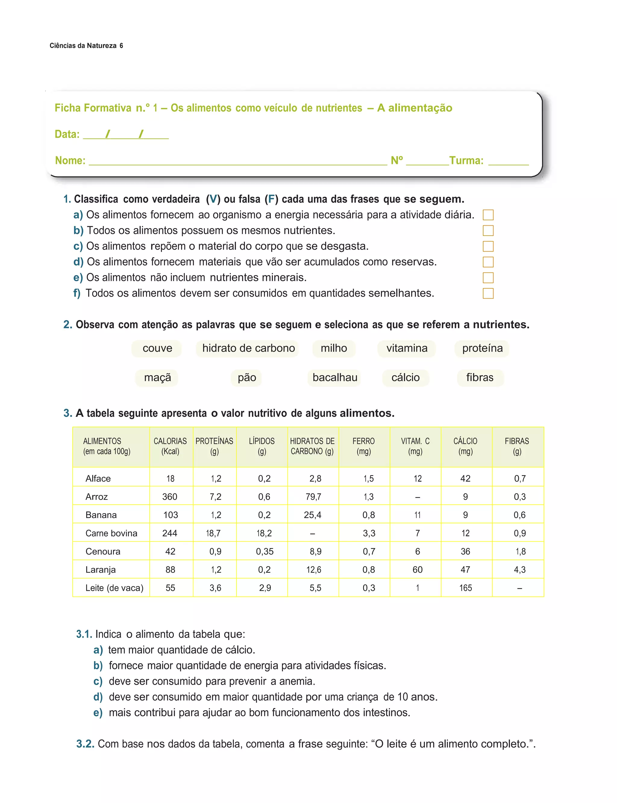 Este documento fornece informações sobre nutrientes em alimentos e segurança alimentar. Ele inclui uma tabela nutricional de alimentos com valores de calorias, proteínas, gorduras, carboidratos, minerais e vitaminas. Há perguntas sobre identificar nutrientes em alimentos, analisar a composição nutricional de diferentes ementas e entender a importância de ler rótulos de alimentos.