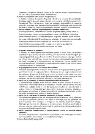 Este documento discute como a genética e o cérebro humano se relacionam. Explica que os cromossomos, genes e DNA são responsáveis pela transmissão genética e como o cérebro é constituído por neurônios que se comunicam através de sinapses. Também descreve como fatores genéticos, sociais e culturais influenciam o comportamento humano e como a complexidade do cérebro permite uma ampla gama de respostas.