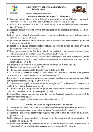 O documento descreve o Império Português e a monarquia absoluta no século XVIII. O Brasil era a principal colônia, sendo o açúcar o principal produto de exportação. Posteriormente, o ouro atraiu os bandeirantes, estabelecendo as fronteiras atuais do Brasil. A sociedade portuguesa era dividida em grupos sociais e a Igreja perseguia judeus. O documento também aborda a reconstrução de Lisboa após o terremoto de 1755 sob a liderança do Marquês de