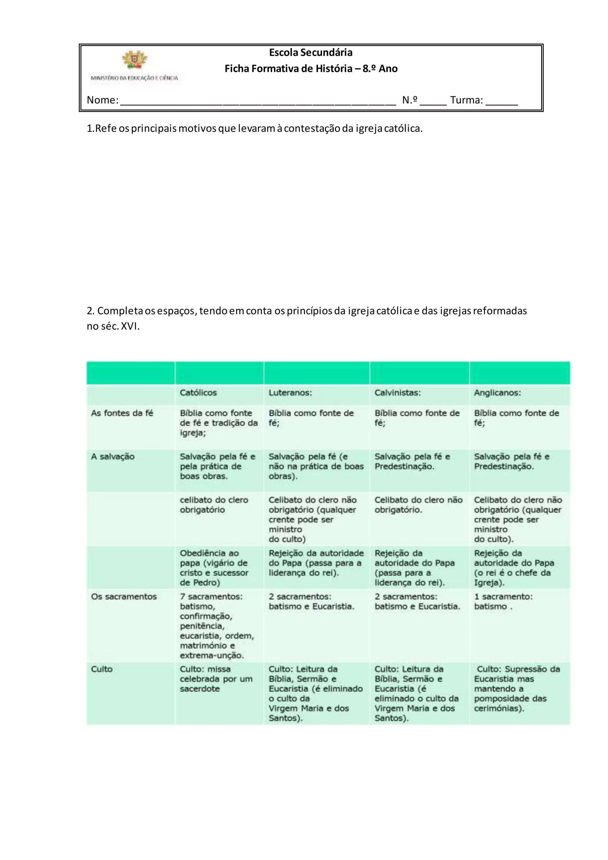 A ficha formativa de história pede aos alunos para (1) resumir os principais motivos que levaram à contestação da Igreja Católica no século XVI e (2) completar espaços sobre os princípios da Igreja Católica e das Igrejas Reformadas no mesmo século.
