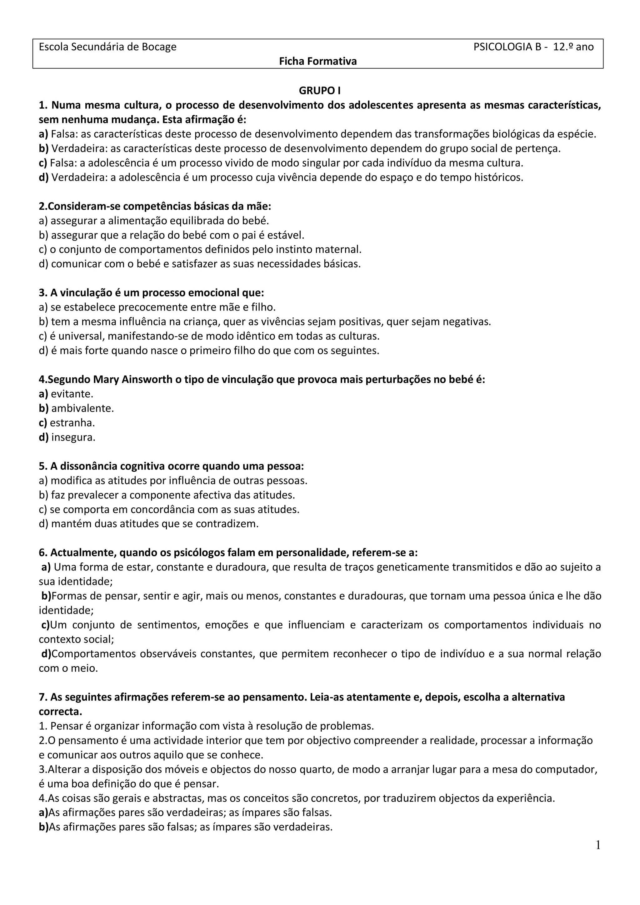 1. O documento contém uma ficha formativa de psicologia com questões sobre vários tópicos como desenvolvimento dos adolescentes, vinculação mãe-filho, personalidade, pensamento, categorização e influência social.