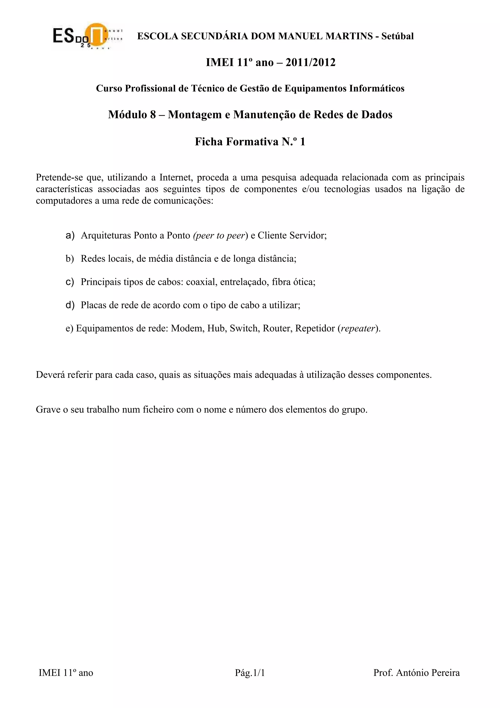 Este documento pede aos alunos que pesquisem sobre as características de vários tipos de componentes e tecnologias de rede, incluindo arquiteturas ponto a ponto e cliente-servidor, tipos de cabos e placas de rede, e equipamentos como modem, hub, switch e router. Os alunos devem descrever quando cada componente é mais adequado e salvar seu trabalho em um arquivo com seu nome e número do grupo.