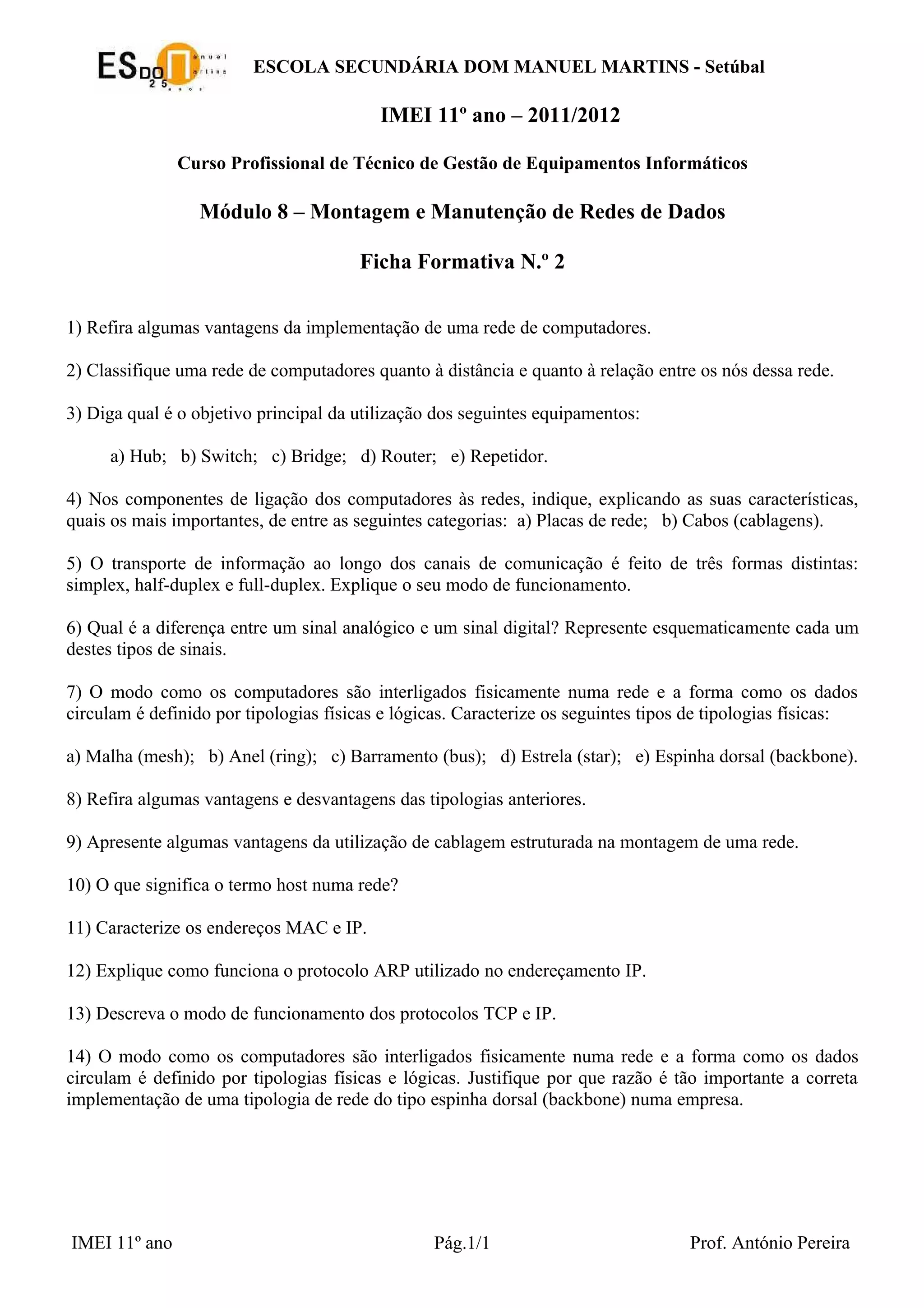 (1) O documento discute vários aspectos de redes de computadores, incluindo vantagens de implementação de redes, classificação de redes, objetivos de equipamentos de rede, componentes de ligação, transporte de informação, sinais analógicos vs digitais, tipologias físicas e lógicas de redes, endereçamento MAC e IP, e a importância de uma tipologia backbone.