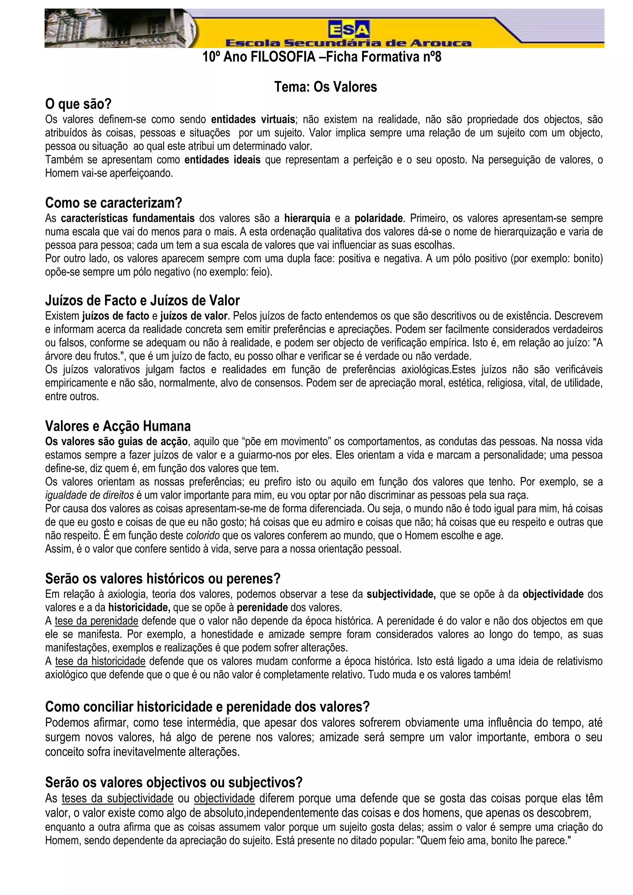 Este documento discute os valores, definindo-os como entidades virtuais atribuídas às coisas por um sujeito. Explora como os valores se caracterizam através de hierarquia e polaridade e distingue juízos de facto e juízos de valor. Finalmente, debate se os valores são históricos ou perenes e objetivos ou subjetivos.
