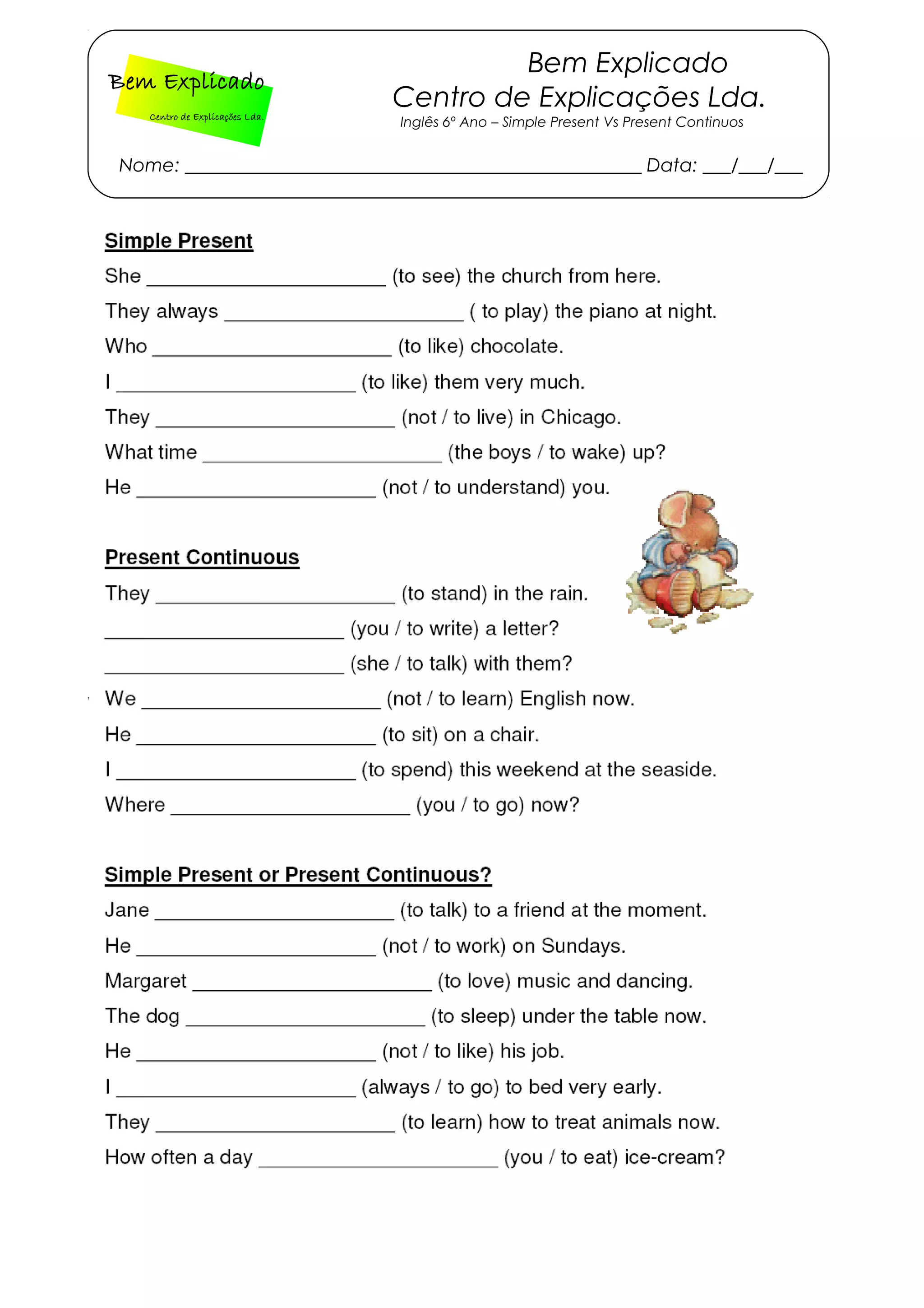 O documento explica as diferenças entre o Simple Present e o Present Continuos em inglês para alunos do 6o ano. Ele aborda quando usar cada um e dá exemplos para ilustrar as diferenças entre os tempos verbais.