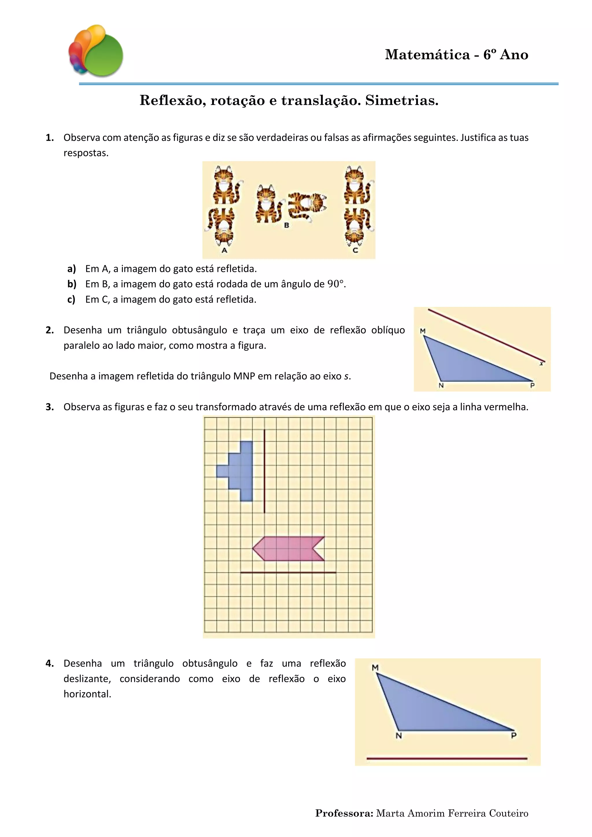 Este documento apresenta um conjunto de exercícios sobre simetrias geométricas como reflexão, rotação e translação. Os alunos são instruídos a identificar e aplicar diferentes tipos de simetrias em figuras geométricas como triângulos, círculos e outros objetos.