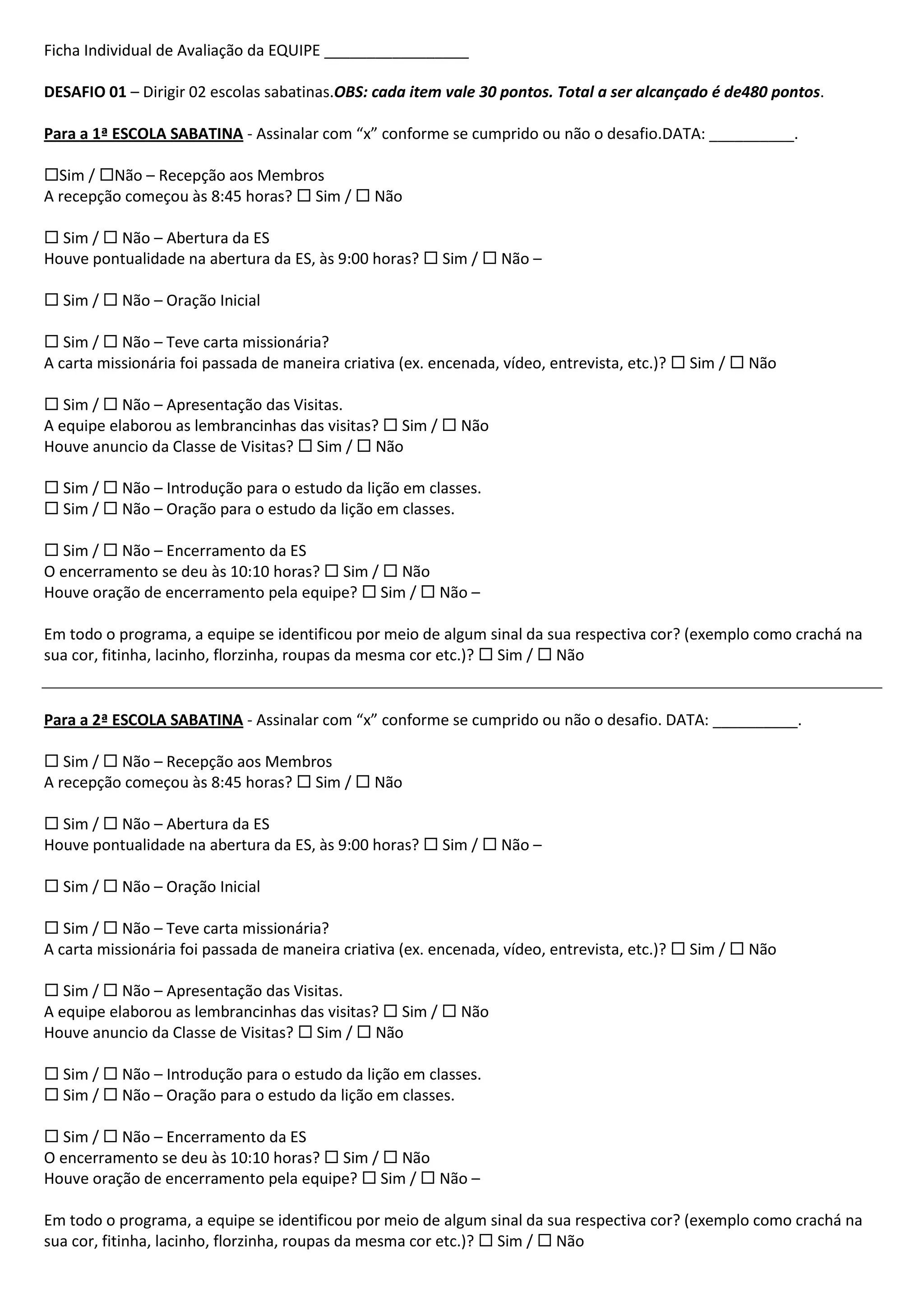Este documento avalia o desempenho de uma equipe em dirigir escolas sabatinas e completar desafios semanais. A equipe recebeu pontos por completar itens como receber membros, apresentar a lição da semana de forma criativa, estudar diariamente e realizar visitas espirituais. Sua pontuação total será usada para ranqueá-los contra outras equipes.