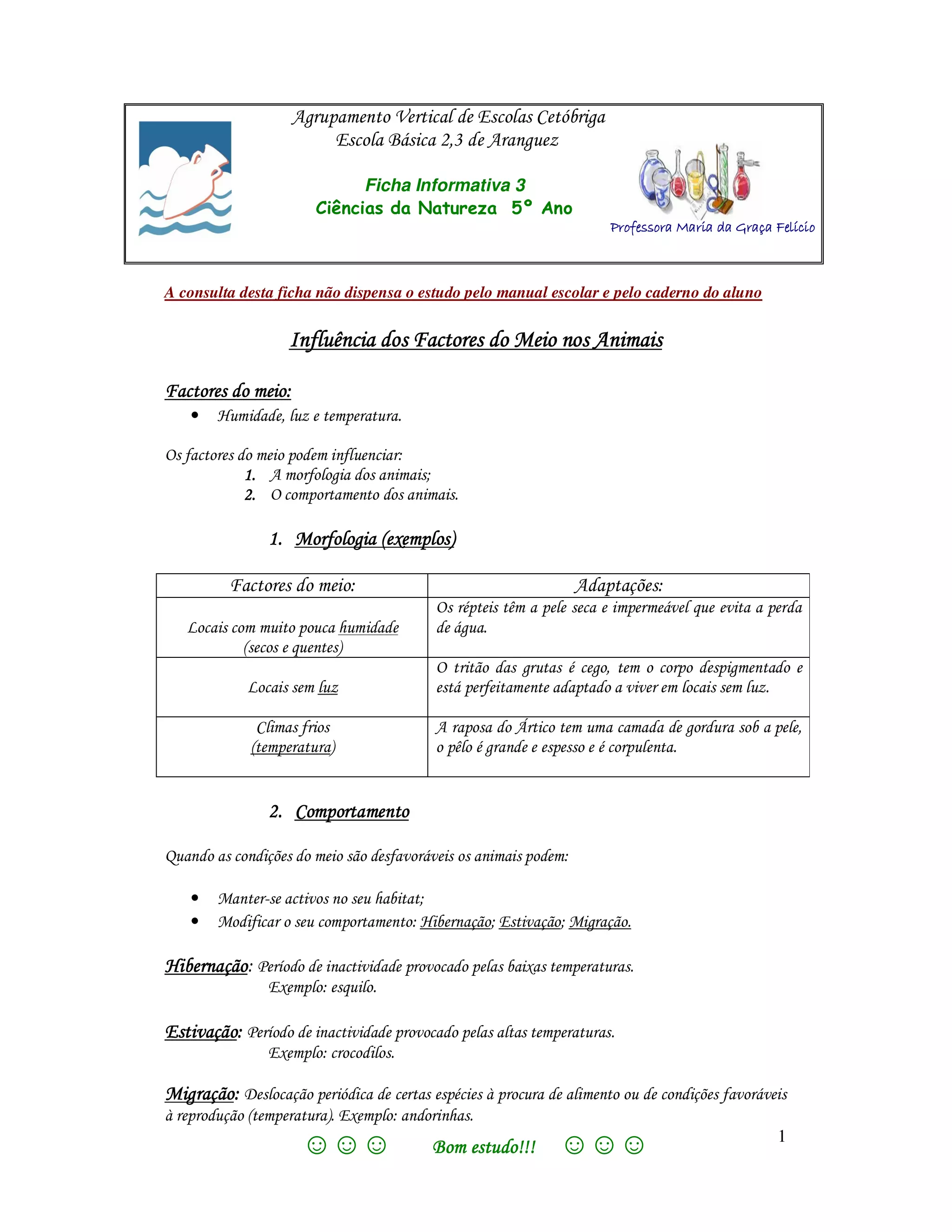 Este documento discute como os fatores do meio, como humidade, luz e temperatura, influenciam a morfologia e o comportamento dos animais. Explica que os répteis têm peles secas e impermeáveis para evitar perda de água em locais secos e quentes, e que o tritão das grutas é cego e despigmentado para viver sem luz. Também descreve que a raposa do Ártico tem pelagem grossa e gordura corporal para sobreviver ao frio ártico. Finalmente, discute como a hib