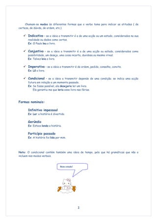 Este documento descreve as principais características do verbo em português. Explica que o verbo expressa um acontecimento no tempo e varia de acordo com o número, pessoa e tempo. Detalha as três conjugações de verbos portugueses com base na vogal temática e apresenta os tempos, modos e formas nominais dos verbos.