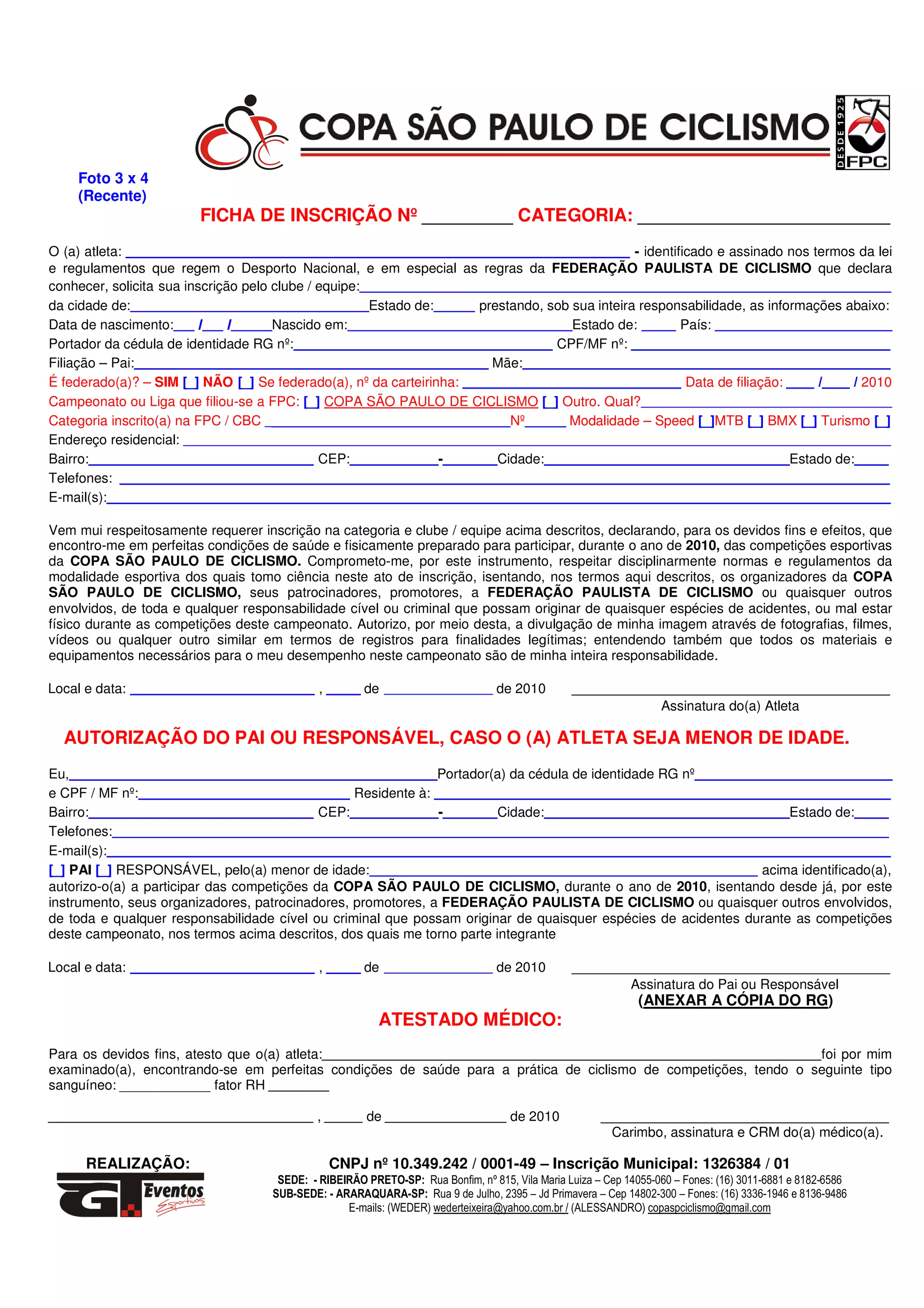 Este documento é um formulário de inscrição para competições de ciclismo que coleta informações pessoais do atleta como nome, data de nascimento, endereço e contato. O atleta declara estar em boa saúde e apto a competir e isenta os organizadores de responsabilidade por acidentes. Um médico deve atestar a saúde do atleta.