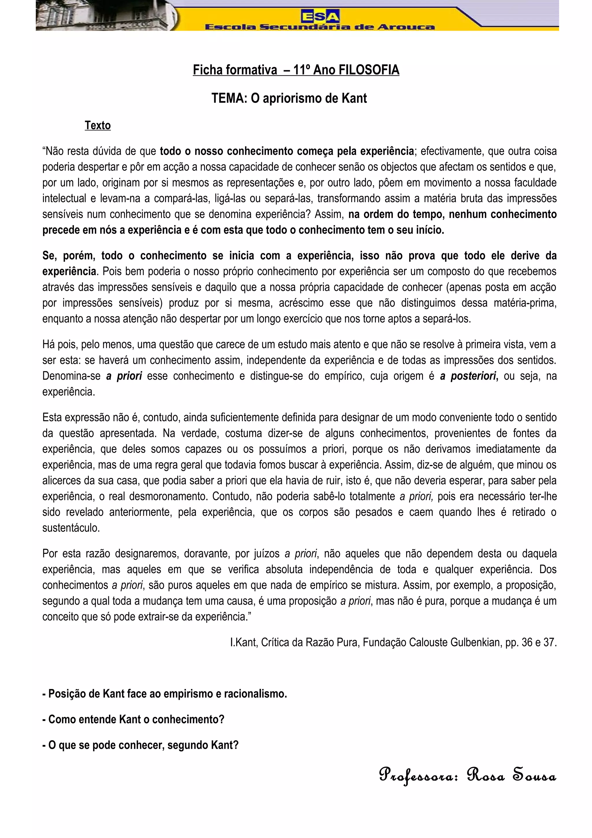 - Kant defende que o conhecimento começa com a experiência, mas não deriva totalmente dela, já que a nossa capacidade intelectual produz conhecimento.