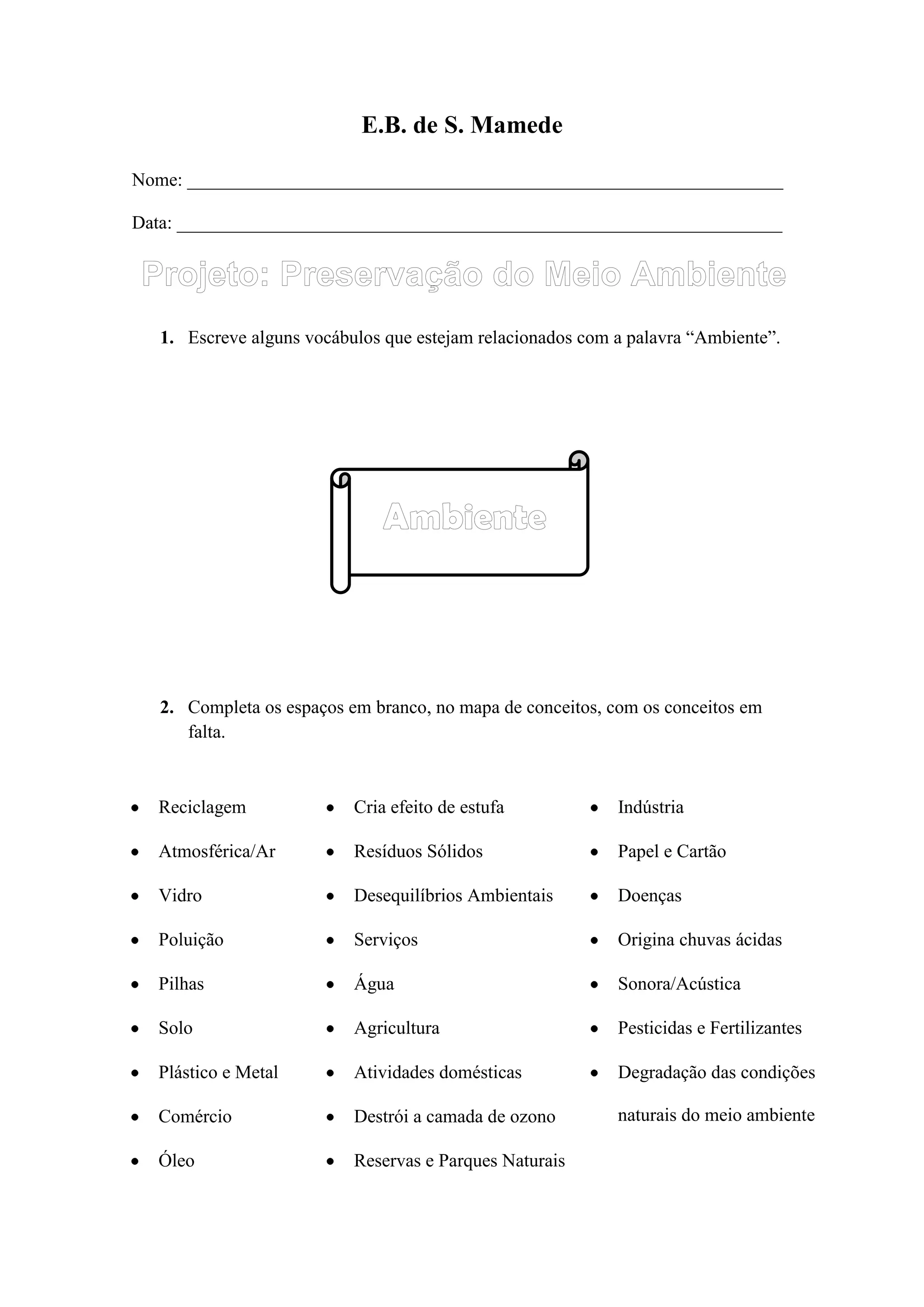 1. Escreve alguns vocábulos que estejam relacionados com a palavra “Ambiente”.
