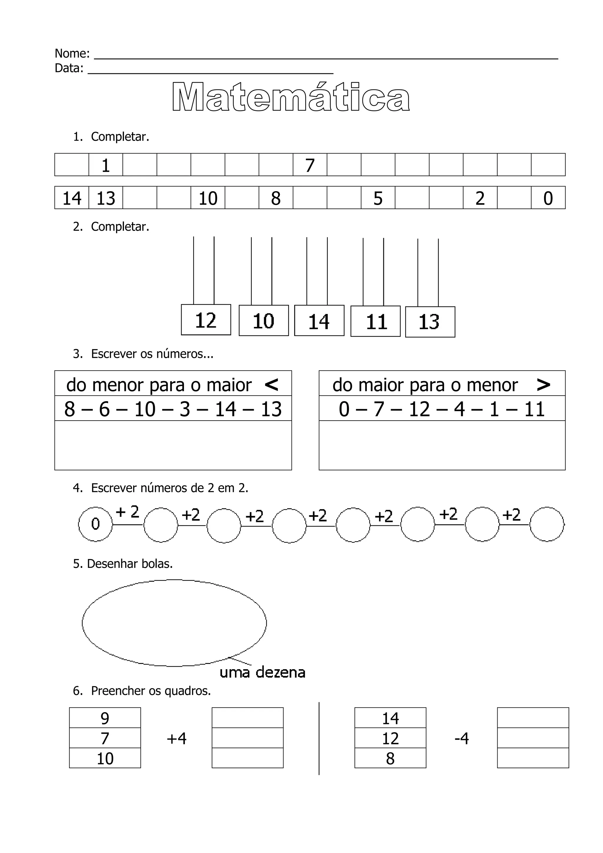 1. O documento contém exercícios de matemática básica como adição, subtração, ordenação numérica e desenhos geométricos. 2. Inclui problemas como quantos ovos ficam em um cesto se 12 ovos foram colocados originalmente e 5 foram retirados. 3. Também pergunta quantos copos uma mãe tem ao somar diferentes quantidades de copos de cores diferentes.