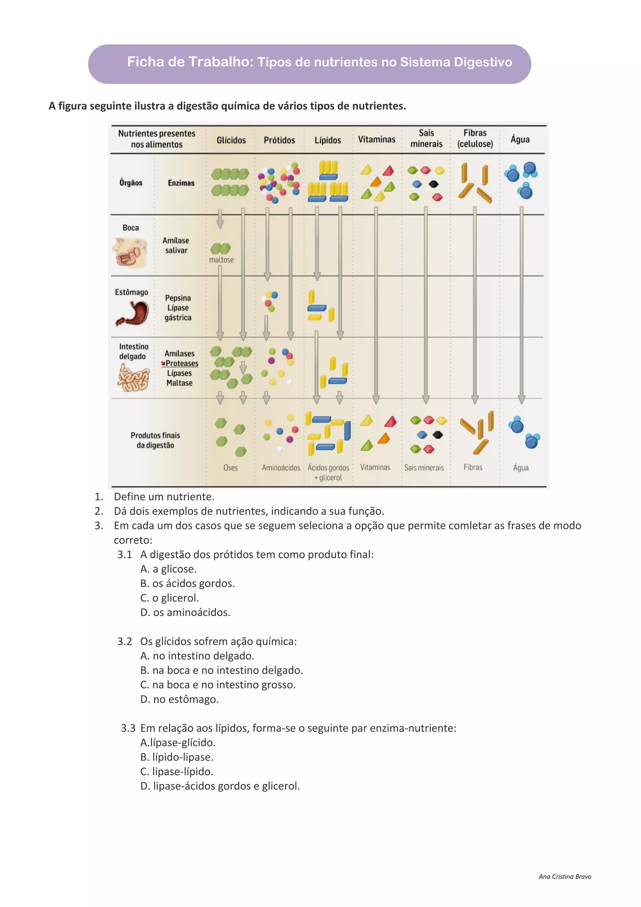 O documento descreve os tipos de nutrientes e sua digestão no sistema digestivo, incluindo que: