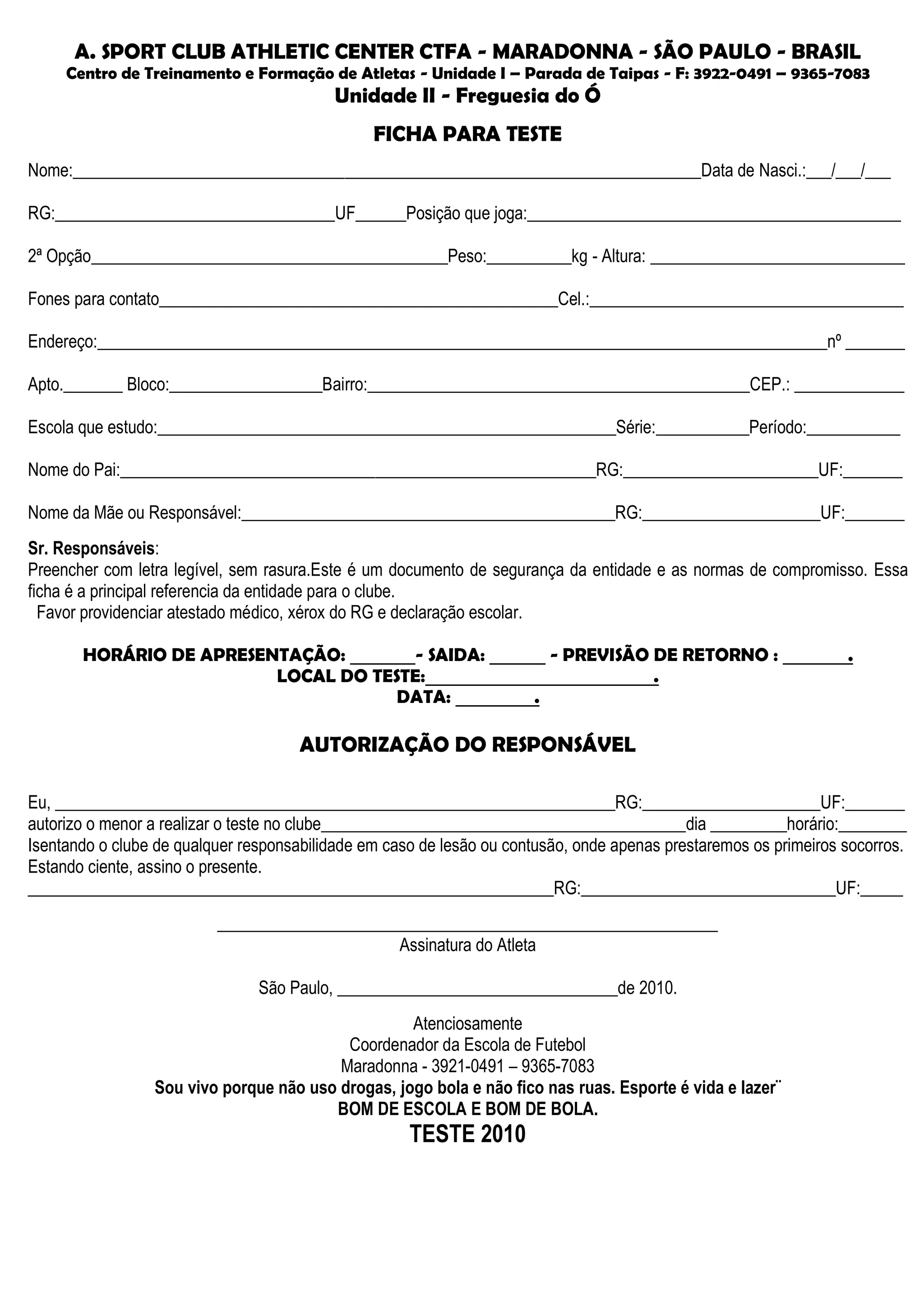 1) É um documento de ficha de inscrição para teste em centro de treinamento e formação de atletas no Brasil.