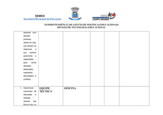 O documento apresenta um plano de ação da Secretaria Municipal de Educação focado em desenvolver competências em professores, utilizando recursos da web 2.0 e Linux Educacional. O objetivo é formar profissionais com habilidades de tomada de decisão e capacidade para lidar com conflitos, além de oferecer momentos de discussão e reflexão. O programa inclui oficinas presenciais e a utilização de tecnologias para enriquecer o aprendizado dos alunos.